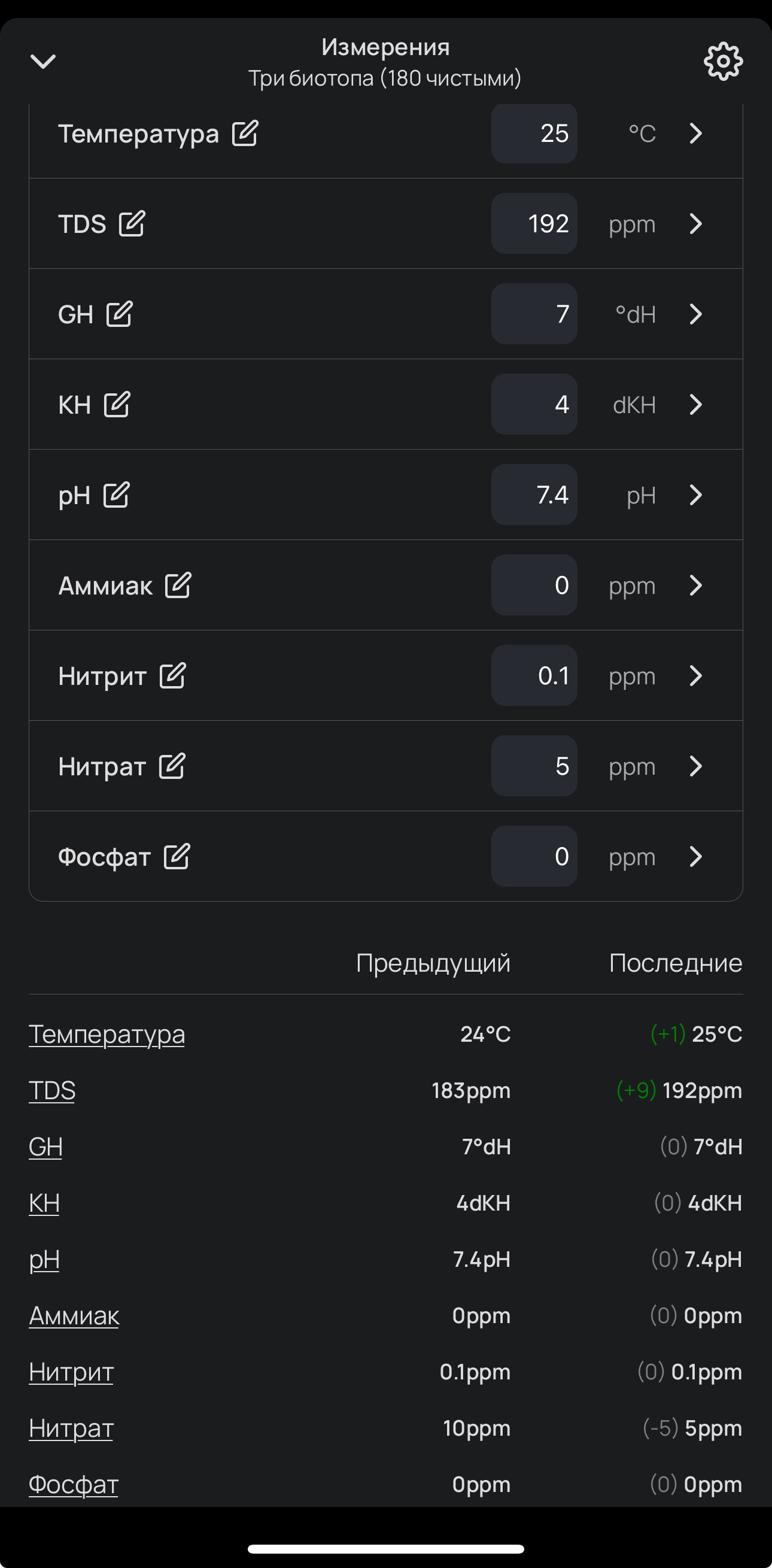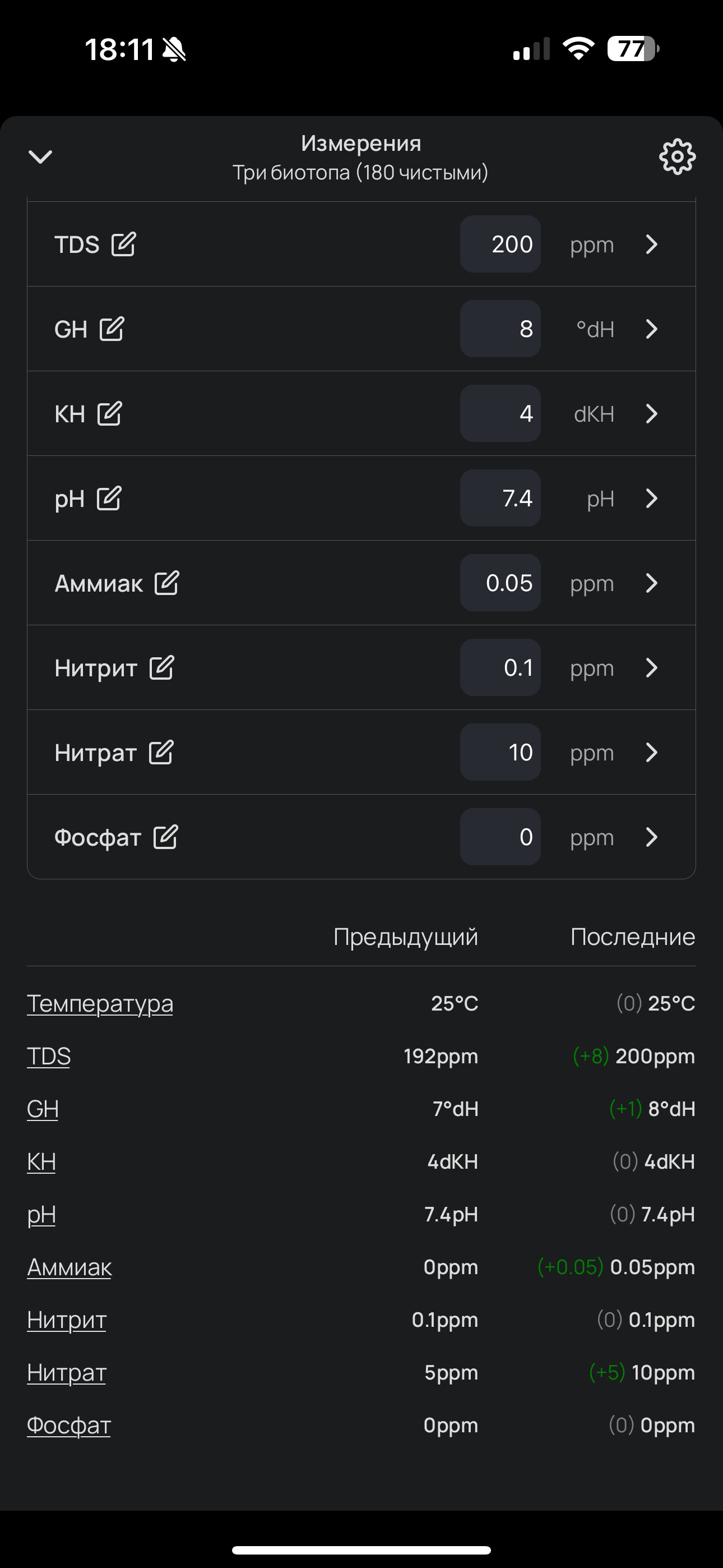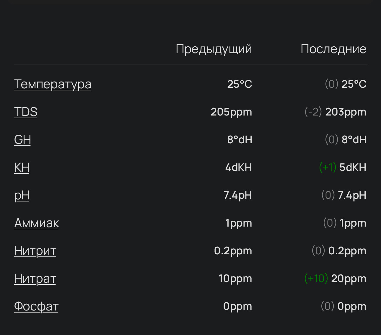 Коррунд 161 Жалоба Опубликовано 5 ноября Чуть опечатался в значениях аммиака за прошлые дни Сегодня день 8 TDS 203 ppm (-2) Gh 8 ( 0) Kh 5 (+1) Ph 7,4 ( 0) Аммиак 1 ppm ( 0) Нитрит 0,2 ppm ( 0) Нитрат 20 ppm (+10) Фосфат 0 ppm ( 0) врда прозрачная, рыб нет, подмены пока не делаю, свет увеличил с 5 до 6 часов Поделиться сообщением Ссылка на сообщение