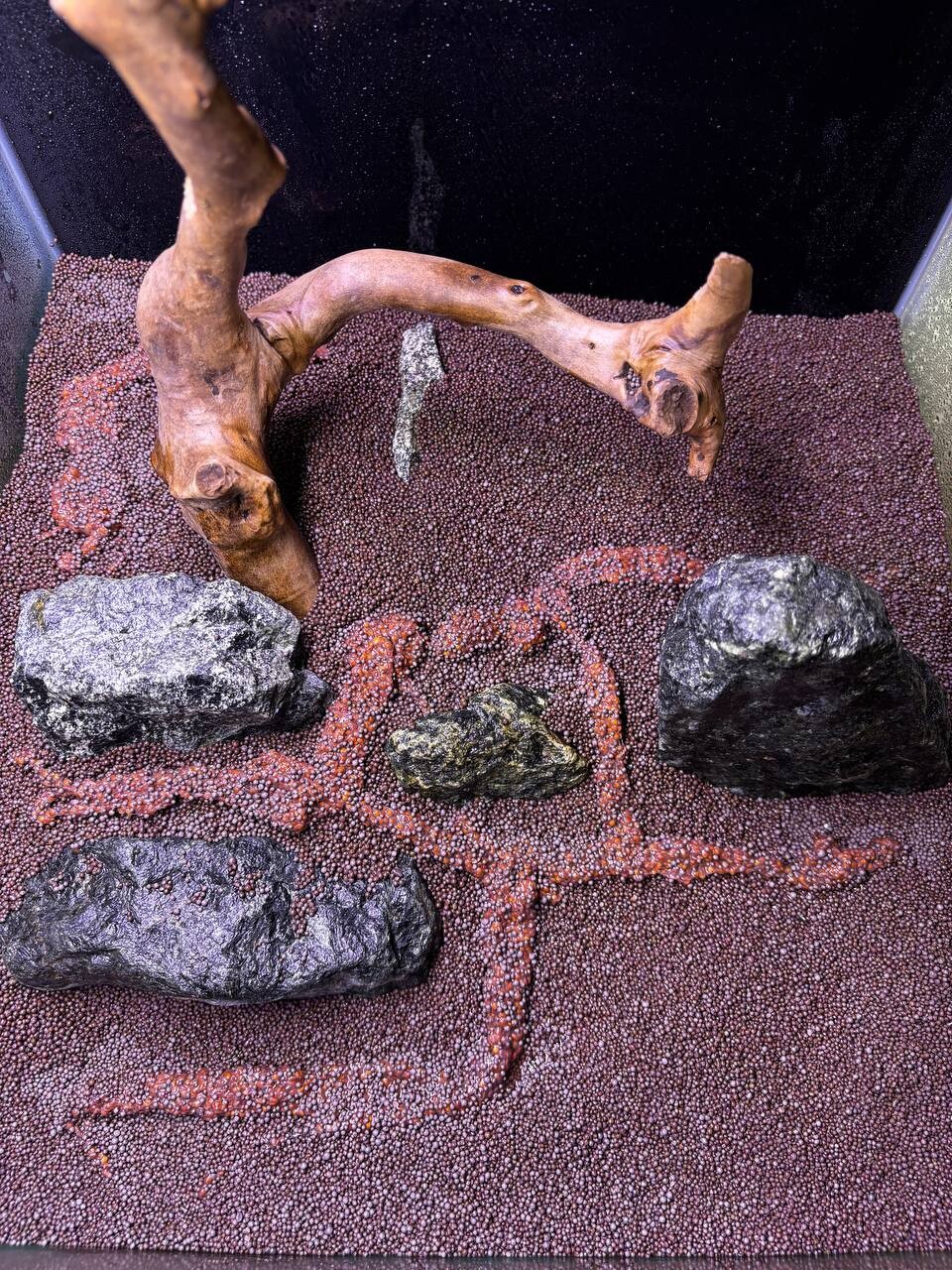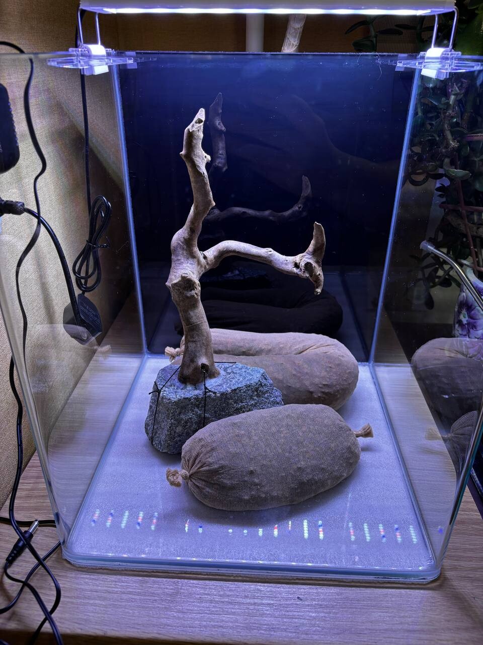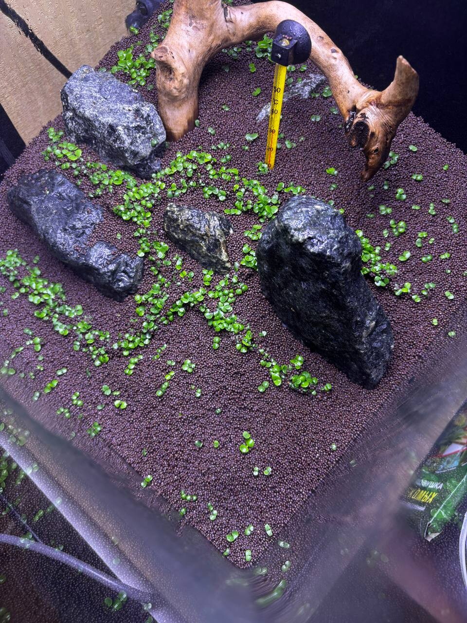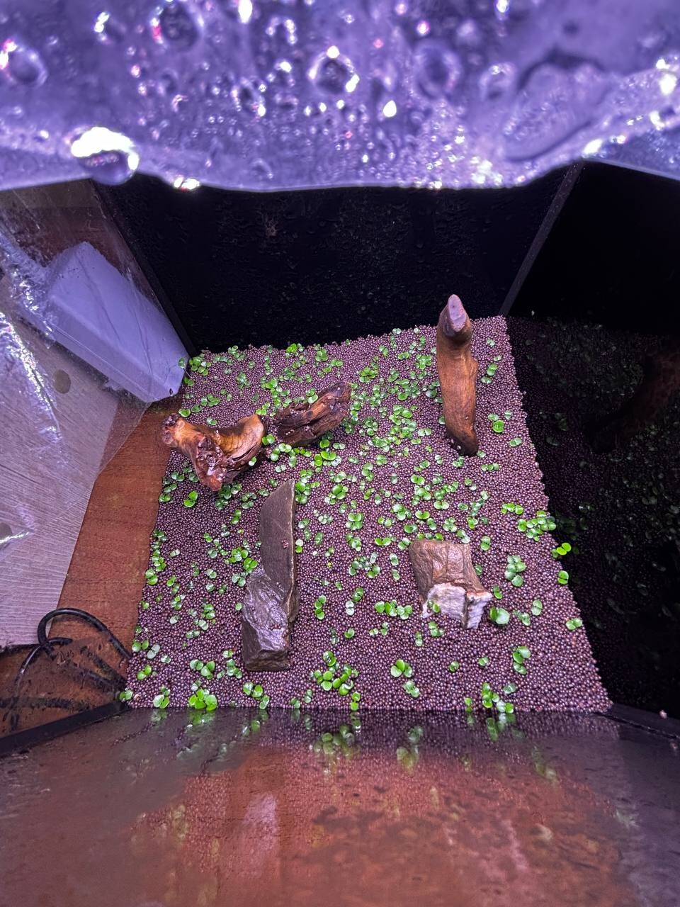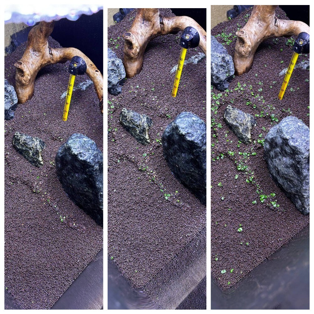 RazDva812 15 Жалоба Опубликовано 1 ноября Всем привет! Решился завести дневник, поделиться потугами, да попробовать пережить бросание тапками. В общем, спустился я недавно к себе в кладовку, и нашел выигранный в далеком 2020 году кубик на 30 литров. Ранее он запускался как отсадник, потом как маленький травник, но в силу жизненных штуковин оба раза разбирался и убирался, а вся запущенная живность и зелень переселялась в основную банку на 250 л. Посидел, покрутил его, и решил запустить, но использовать максимум из уже имеющегося оборудования и наполнения. Долго думал, чего же от него хочу, и в итоге решил постараться сделать забавную коврушку для креветосов. Так или иначе, если все окажется зря, то пересажу всех пацанов (и пацанесс) в основную банку. В первую очередь достал лаву, пропант, коряжку и каменюк (диабаз), все это промыл, нещадно прокипятил, высушил, да составил нехитрую композицию. Всегда боялся таких объемов, поэтому решил напихать лавы и грунта с запасом, но из расчета грунта на 5 см у фронтальной стенки. В итоге получил довольно толстый слой, т.к. не учел дополнительный объем лавы, считая все на калькуляторе, но время и летящие тапки покажут, насколько это решение имеет право на жизнь. Спойлер: подозреваю, что решение неверное, но на то это и эксперимент чтоб танцевать на граблях. Обдумывая наполнение сразу решил, что коли хочется коврик, то посадку надо делать покучнее, однако затаскивать из магаза улиток и планарий (были случаи) не особенно хотелось. В итоге из любопытства взял на озоне семена: Монте Карло и Глоссостигму. В отдельное ведерко накидал песочка, высыпал несколько семечек, полил. Через трое (вроде) суток увидел всходы, и решил двигать эту попытку дальше. Замочил Глоссостигму на 12 часов по инструкции на упаковке, и из получившихся слизистых сарделек сформировал места, где хочу посадку поплотнее, да и просто посыпал вокруг, из пакетика на 10 грамм ушло ровно 5. Все это дело присыпал парой жменек пропанта, закрыл пленкой, да нещадно пшыкал (и пшыкаю) каждые 4 (+/-) часа из бутылки с водой и каплей удобряшки Aquabalance Тотал (подсмотрел в отзывах на озоне такой окололайфхак, решил попробовать, но не сильно верю в его эффективность). "Сопли" накидал 28.10, на данный момент (01.11) имеем такой вот коллаж за три дня (30.10-01.11): Также уже имеется колокол для СО2 от Ista (есть у кого опыт использования?) и внутренний Sera X-Edge 300 (который когда-нибудь будет заменен на рюкзачок), а вот свет пришлось докупить, взял на озоне бюджетный вариант в количестве двух штук, итого имеем якобы аж 77 люмен на литр (по заверениям продавца), что многовато на мой вкус, но пока семена растут-норм. После запуска планирую просто убрать один, и как будто этого может быть вполне достаточно. Запуск планирую на бутылочной воде со стартером от Prodibio. В планах на заселение 2-3 аманки, выводок чериков и несколько неонов. Из растючек хочется намотать на корягу мха (склоняюсь к яванскому), и дополнить чем-то стебельным, но простым. Собственно, хочется понять, насколько вообще я все делаю правильно/жизнеспособно, и куда стоит подстелить соломы? Или стоит разобрать и переделать? Буду рад любым советам и тапкам, скилл хочется качать, пробовать и расти. Всем добра! 5 Nevidimka, Коррунд, AnaAna и 2 люди отреагировали на это Поделиться сообщением Ссылка на сообщение