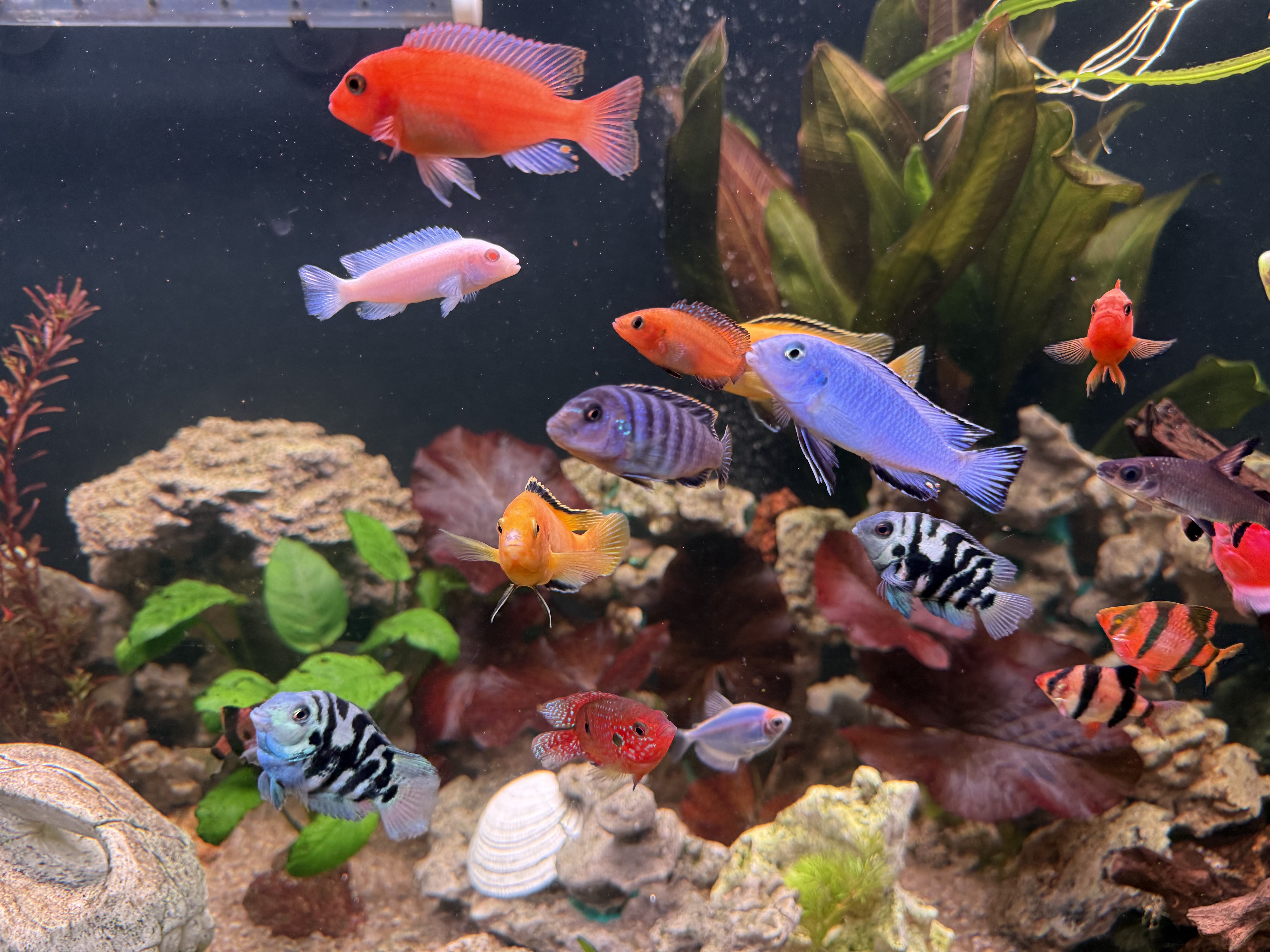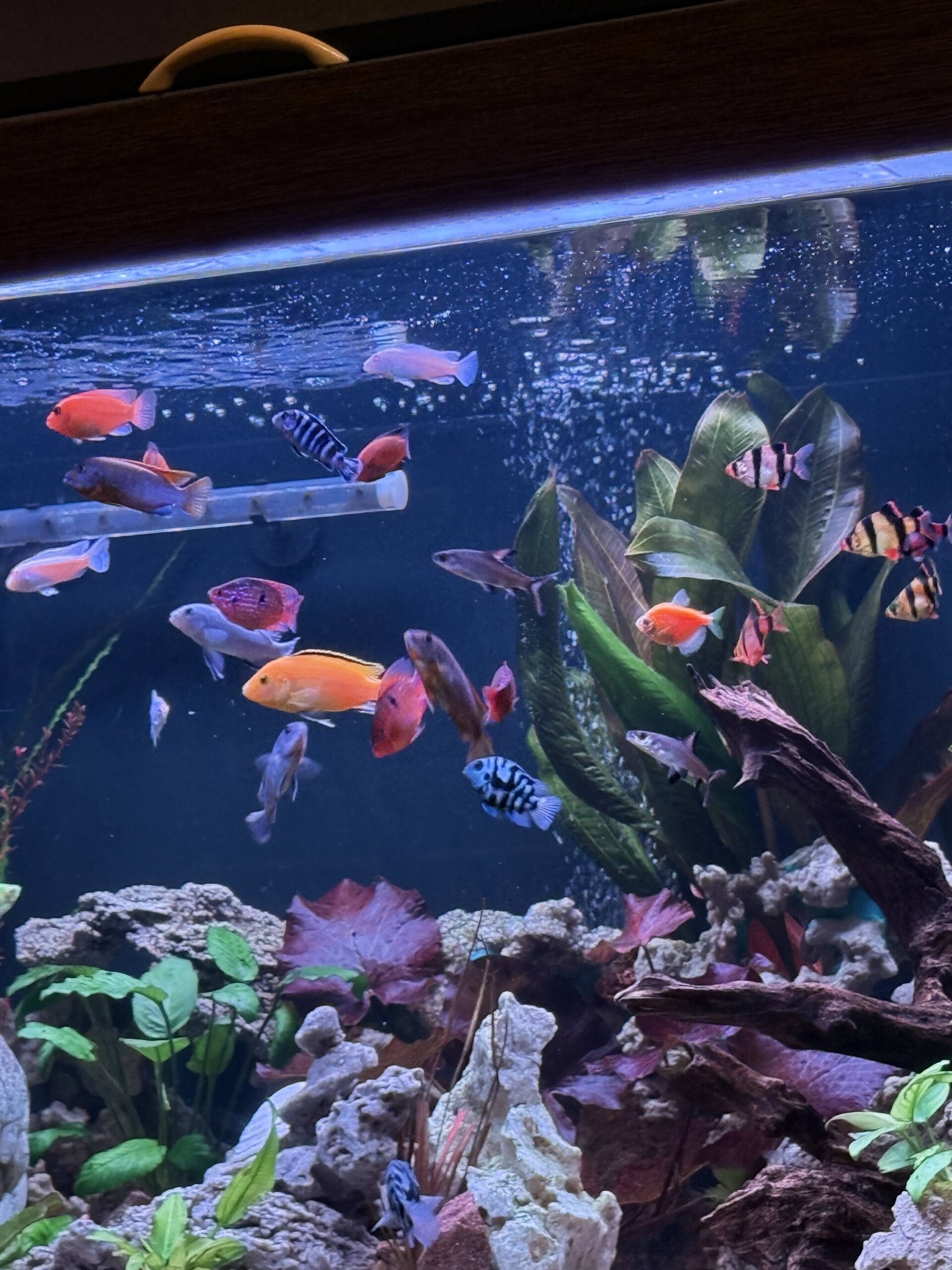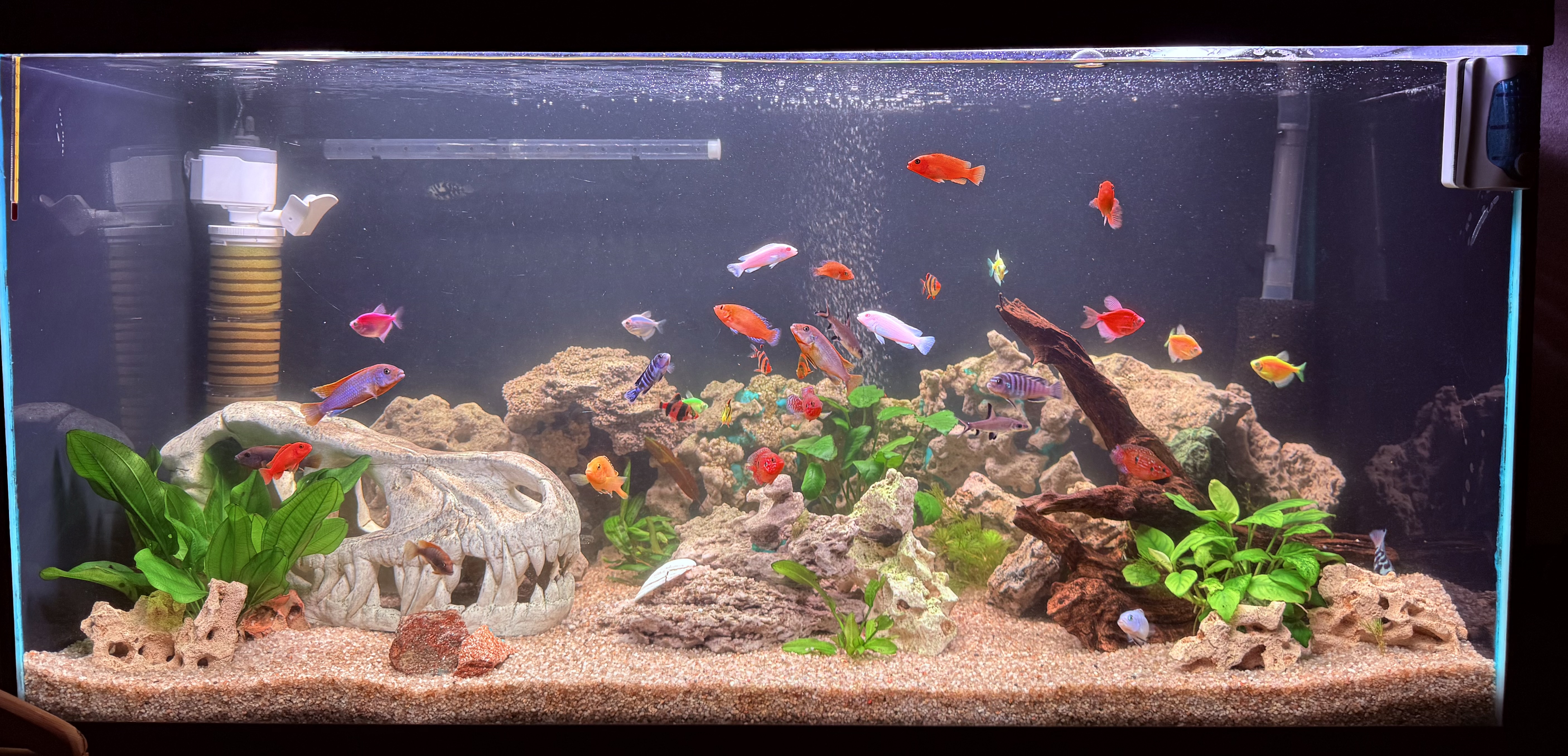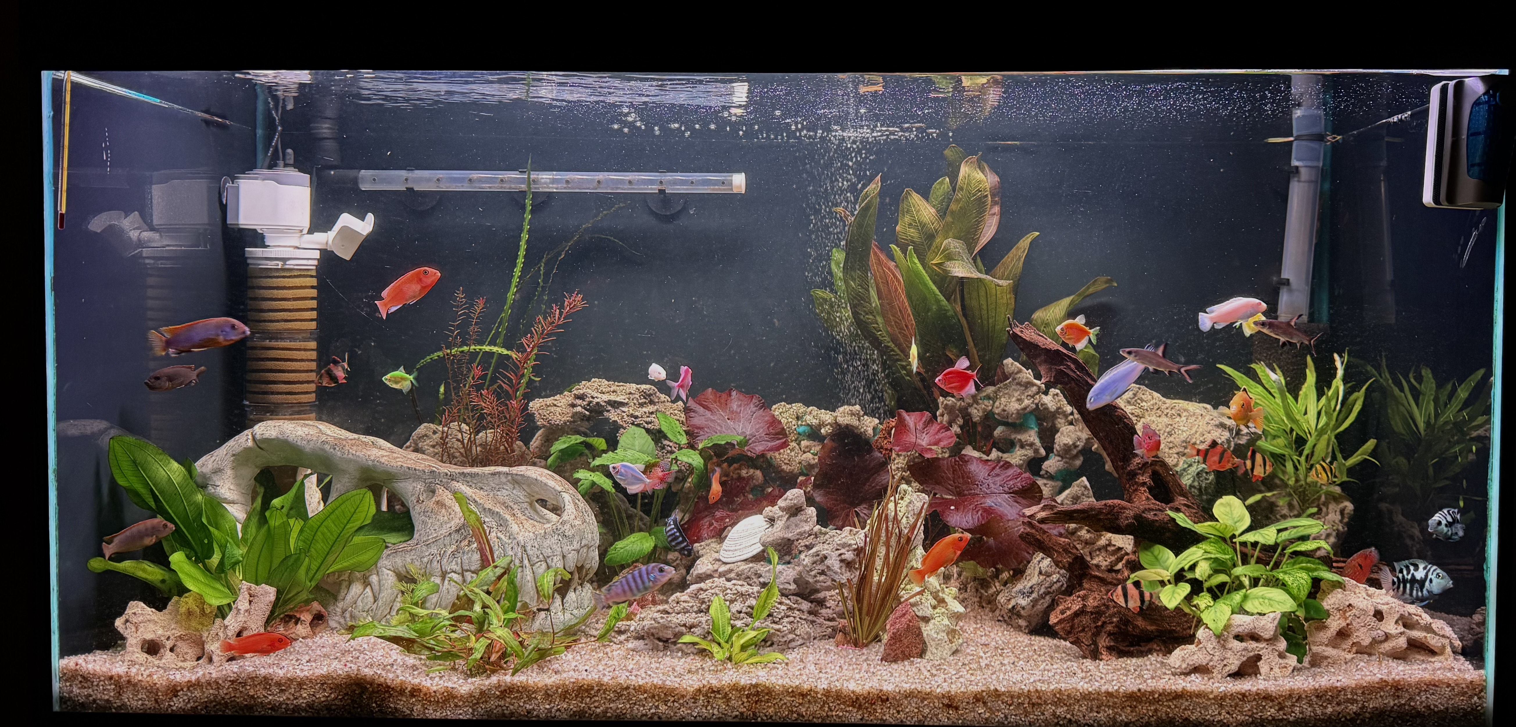Yuracmw 28 Жалоба Опубликовано 7 декабря, 2025 Всем привет! Прошло уже 2 недели с новым светом. Сказать, что я доволен, это не сказать ничего. Не зря почитал много обзоров, посмотрел видео. И реально могу сказать, что свет стоит своих денег. Аквариум прям расцвел. Аквариум стал стабильней, вода прозрачная (правда когда не ворошат грунт), рыбы все чувствуют себя хорошо. Тернеции и барбусы прекрасно существуют с цихлидами, никто никого не трогает. Я бы даже сказал, что барбусы сами иногда задевают цихлид. Еллоу регулярно нерестятся как и йодотрофеус шпренгера регулярно нерестятся. Даже в камнях нашел нескольких мальков, которые живут уже почти 2 недели, активно едят и потихоньку уже начинают выплывать подальше от своих убежищ. Их размер сейчас уже 1,5 см. Вчера сделал тесты: PH - 7.65 KH - 4 GH - 10 NO2 и Аммоний - 0 NO3 - 20 PO4 - почти 1. Что-то нитраты и фосфаты прям великоваты. Рыб кормим только сухими кормами, съедают все буквально за 2-3 минуты, на дно ничего не падает. Растения кстати чувствуют себя хорошо, после установки нового света, прям пошли в рост и листья стали достаточно плотными. А то после использования Альгишока, листья стали очень тоненькие и бледные. Бактерии Prodibio использую по 1 ампуле раз в 2 недели. Буду рад рекомендациям по нитратам и фосфатам. 4 Поделиться сообщением Ссылка на сообщение