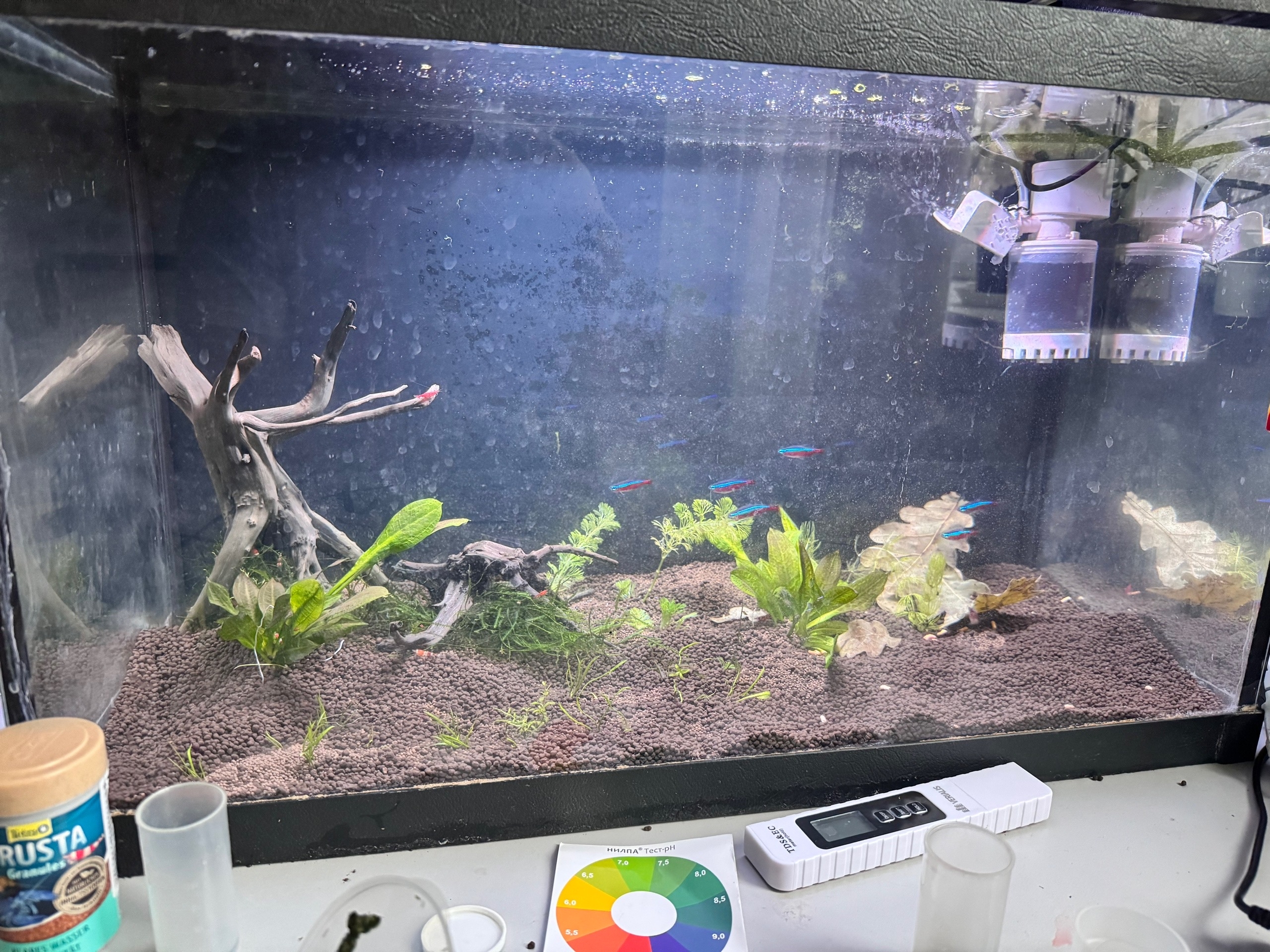 Timo 0 Жалоба Опубликовано Sunday в 10:23 Всем доброго времени суток! Приобрел себе травник литров на 65–70. Купил грунт Premium Soil 8 л. 1,5–3,5 мм, запустил 6 неонов и посадил немножко зелени. Сегодня 2-й день, креветосы все живые (около 15 «Кровавых Мэри» и 10 «Красный кристалл»). Параметры воды: pH 7,5–7,0; GH: 8; TDS: 151; Осмоса нет! =( Вода трубопровод. Подскажите и дайте совет новичку в следующем: 1) Как часто менять воду, читал 1 раз в неделю 10%. 2) Как чистить грунт, если хочу посадить ковром всё? 3) Как быть с освещением? 4) Поедят ли неоны молодняк креветок, если таковой будет, или икру неонов (креветки)? 5) Нужно ли присыпать верхним слоем грунт «Соил», чтоб его не размыло? 6) Нужен ли внутренний фильтр или можно обойтись аэрацией? 7) Какие растения посоветовали бы посадить? 8) Сколько креветосов можно безболезненно содержать в такой банке (читал, 1 шт. = 1 литр)? По плану сделать красивый травник и разводить креветосов и растючку для души. Поделиться сообщением Ссылка на сообщение