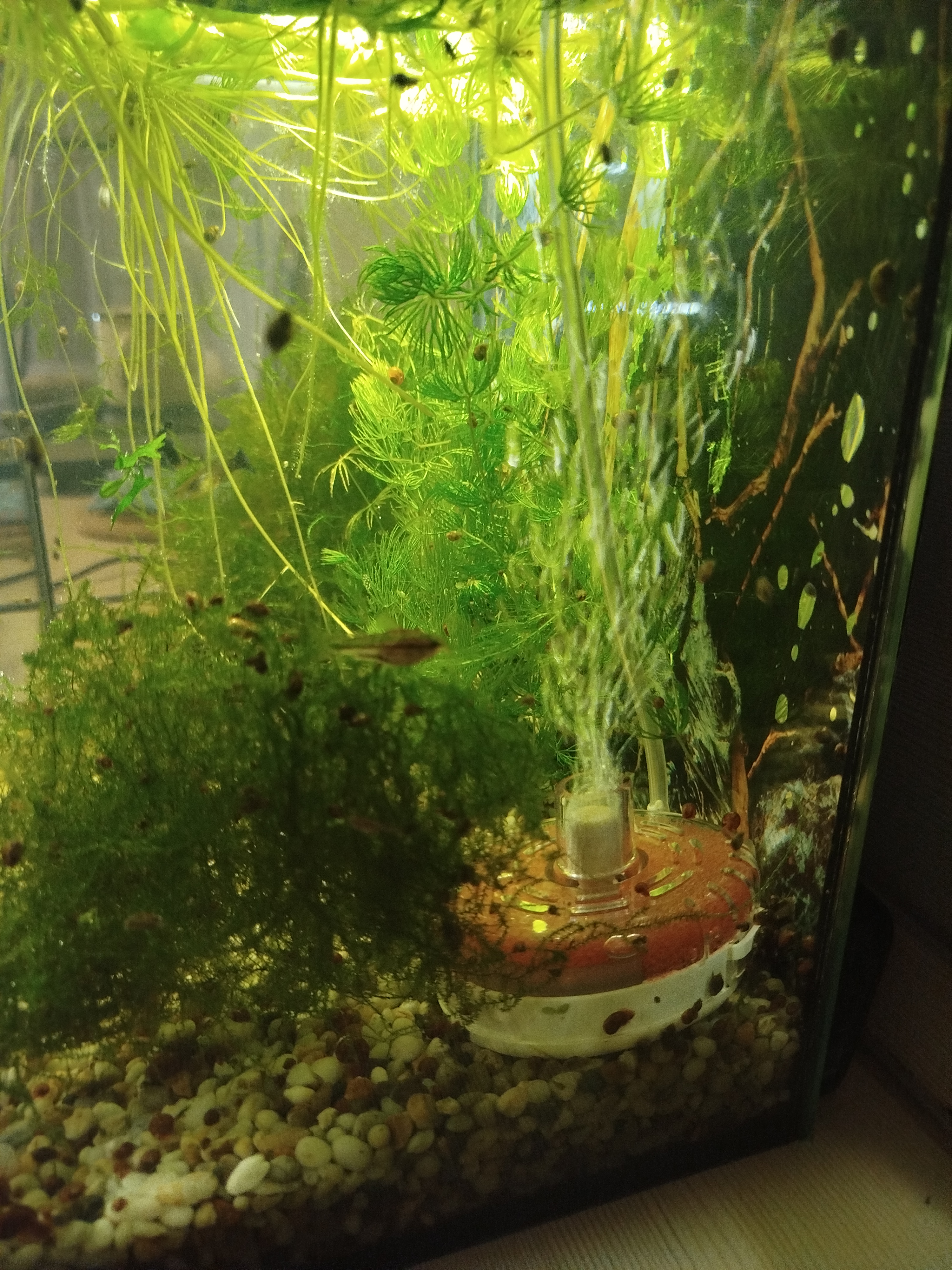Юкля 2 Жалоба Опубликовано 21 декабря, 2025 Аквариум 20 л, население: 6 взрослых гуппи+ мелкие, 7 пигмеев, 3 Хелены, которые планировалось, что уменьшат численность улиток, но похоже просто живут в своё удовольствие. Стоит фильтр аэратор до 30 л, но что то ме подсказывает, что как аэратор работает нормально, а вот как фильтр работает так себе. Вопрос стоит ли поставить второй, у меня есть Барбус самый простой, но работает только как фильтр, аэратор почему то не работает Поделиться сообщением Ссылка на сообщение