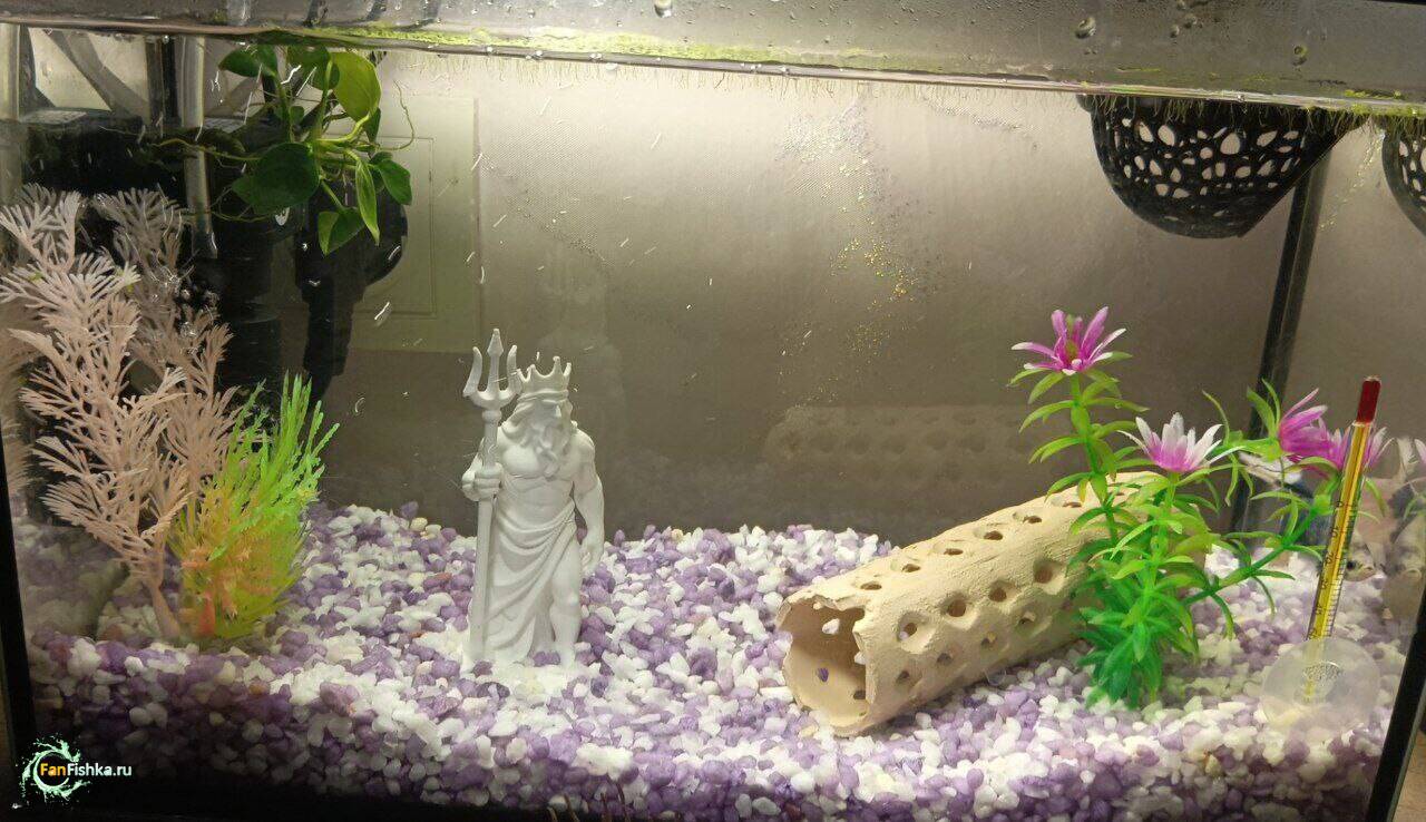 Ника 9613 Жалоба Опубликовано 18 января @Buby грунт лучше заменить на что-то с более натуральным видом. Грунт пропант, или кварцевый песок 2-3 мм пластиковые декорации и пластиковые растения тоже лучше убрать, это моветон. Воду можно оставить она все-таки более живая чем новая из-под крана. И живое растение тоже оставьте, это анубиас, его обычно приматывают к камню/коряге Поделиться сообщением Ссылка на сообщение