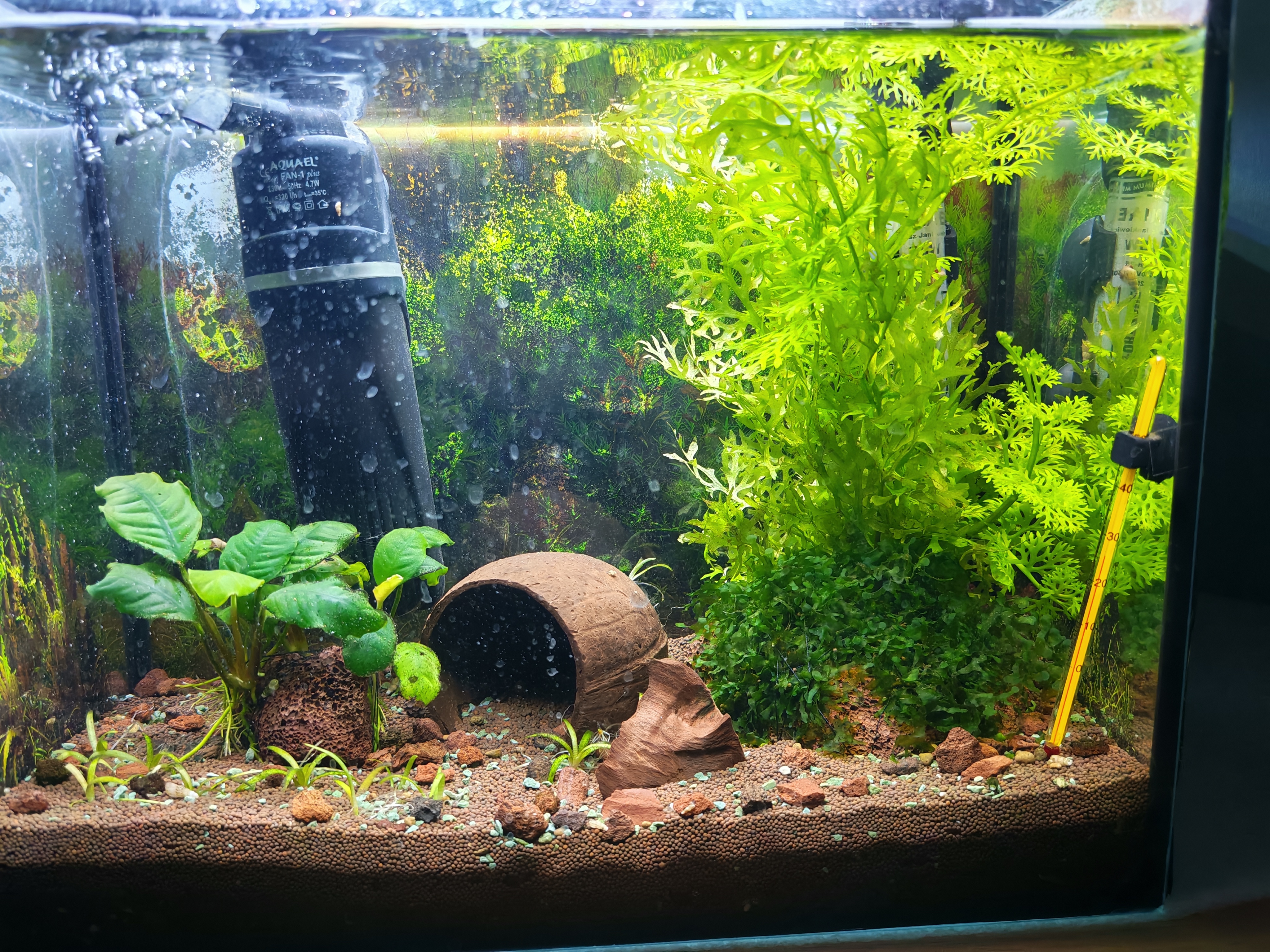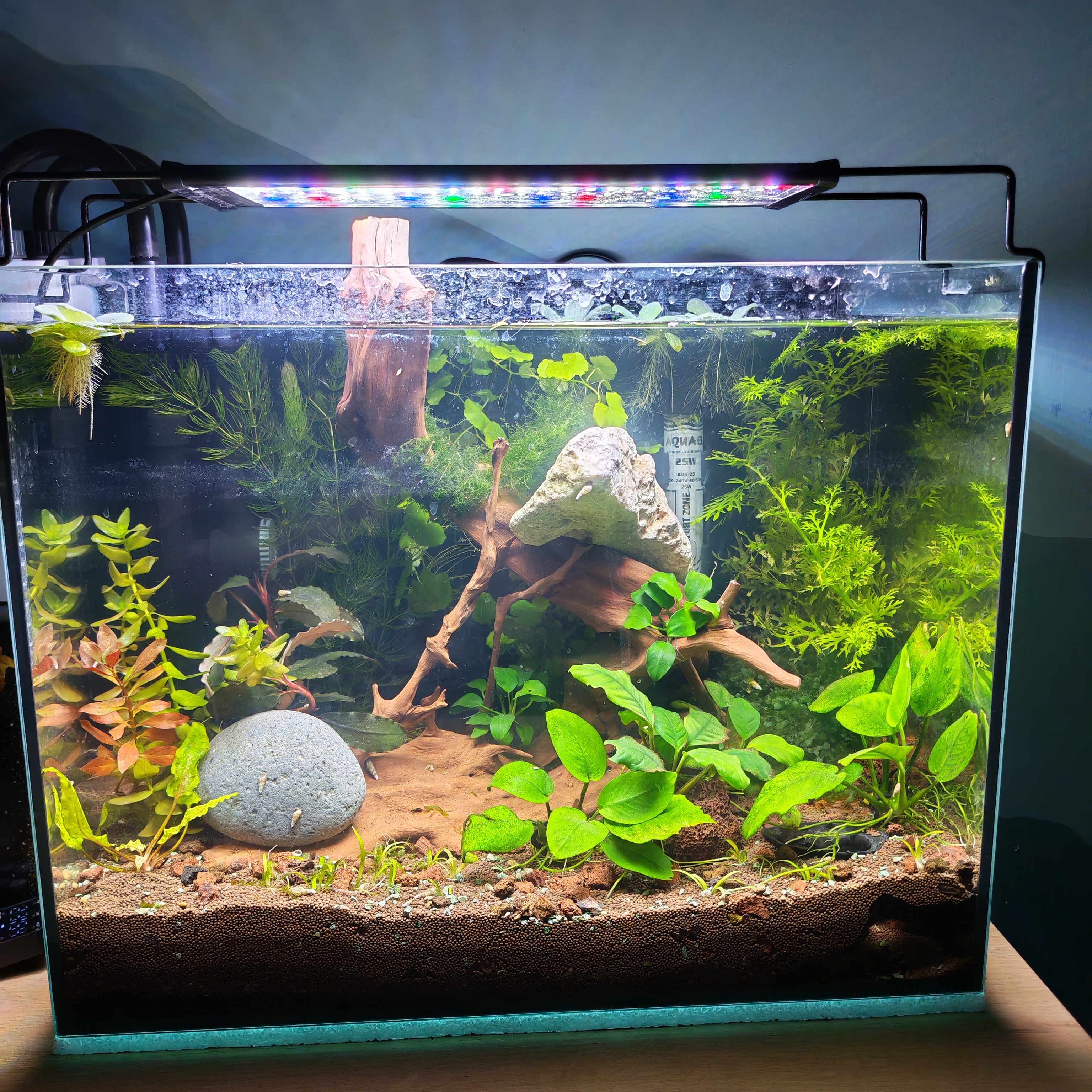 Идария 5 Жалоба Опубликовано Tuesday в 22:22 Добрый день всём заглянувшим. Меня зовут Даша. Я из Пензы. Хотела бы вести дневничок аквариума, что бы наблюдать за изменениями, но в основном для получения советов и обмена опытом. Давно был опыт с аквариумами, когда жила с родителями и занимались ими с мамой (7 л, 20 л, 30 л, 50 л, 100 л), но в итоге стоял только 100 л лет 7, а в 2022 году и его продали. Сейчас очень загорелась аквариумом с большим количеством растений и мечтой детства - красивым петушком 😍 . Ранее пытались держать несколько петушков, но всегда они жили не очень долго из-за плавниковой гнили, аналогично было и с гуппи. После всех тех попыток страшновато заводить петушка, но надеюсь, в этот раз, с помощью форума и лучшей подготовки, всё получится 🤞 Предыстория запуска 12.01.26 я запустила аквариум 20 л, который лежал у родителей. Фильтр (aquael fan1 plus), нагреватель тоже были, поставила что есть. Купила растения, лампу и тесты. Чисто воды по итогу в нём оказалось 13-14 литров всего. 16.01 по тестам было pH 7,5, kH 4, gH 7, нитрат 40, нитрит 0, аммиак 0, фосфат 5. Делала небольшие подмены, в итоге нитраты снизились до 10, фосфаты 3-4. Долго и много про него не буду, т.к уже через неделю я поняла, что хочется аквариум побольше 😉 . Читала и смотрела много, но наверно всё таки запуталась, сделала и купила лишнее, а что-то наоборот не сделала 😩 Место для аквариума только одно - на рабочем столе, поэтому выбирался по возможному размеру, а не желанию. Итак запуск 25.01.26 - Объем 35 литров (42*25*33 см). Чисто воды получилось пока 23 литра. Если убрать камни, которые держат корягу и долить, может 25 л получится - Грунт пропант 3-5 см. Его отдали из действующего аквариума (меняли пропант на кварц). Снизу уложена питательная основа AQUAERUS 1-1.5 см - Вода 5 литров изначально была из действующего аквариума, остальное водопроводная. Отстаиваю 1-4 дней в среднем. - Фильтр рюкзак SUNSUN XBL-300 5W 300Л/ч. Наполнение - губка, шарики, пуриген (советовали), синтепон (но его хочу убрать, слабо работает фильтр). На вход поставила губку как префильтр - Свет. Пока стоит SEAOURA 14 Вт 893 Лм, 5 режимов. По свету есть вопрос, как определюсь, дополню. - Декор. Коряга (не знаю что за дерево раньше стояла в аквариуме), несколько лавовых камней - Растения. Гидрокотилп, роголистник, папоротник, анубис, буцефаландра, яванский мох, печёночный мох, сагитария?, несколько дали в подарок, не знаю что это - Население. Улитки мелании, катушки, вроде хелена и 2 креветки. Все попали с грунтом или растениями, специально никого не подсаживала. Вопрос с катушками, стоит ли оставлять. Если действительно хелена попалась, они же еда для неё? А вообще планируется петушок и коридорасы панды или пигмеи. Нравится анциструс, и коряга большая есть, но наверно мало места ему. Для стайки разбор или неонов тоже наверно маловато. А креветок петух съест, хотя тоже хотелось бы. Вроде про всё расписала. Надеюсь кому-то будет интерсно наблюдать за дневником. Завтра напишу вопросы, которые есть 5 Поделиться сообщением Ссылка на сообщение