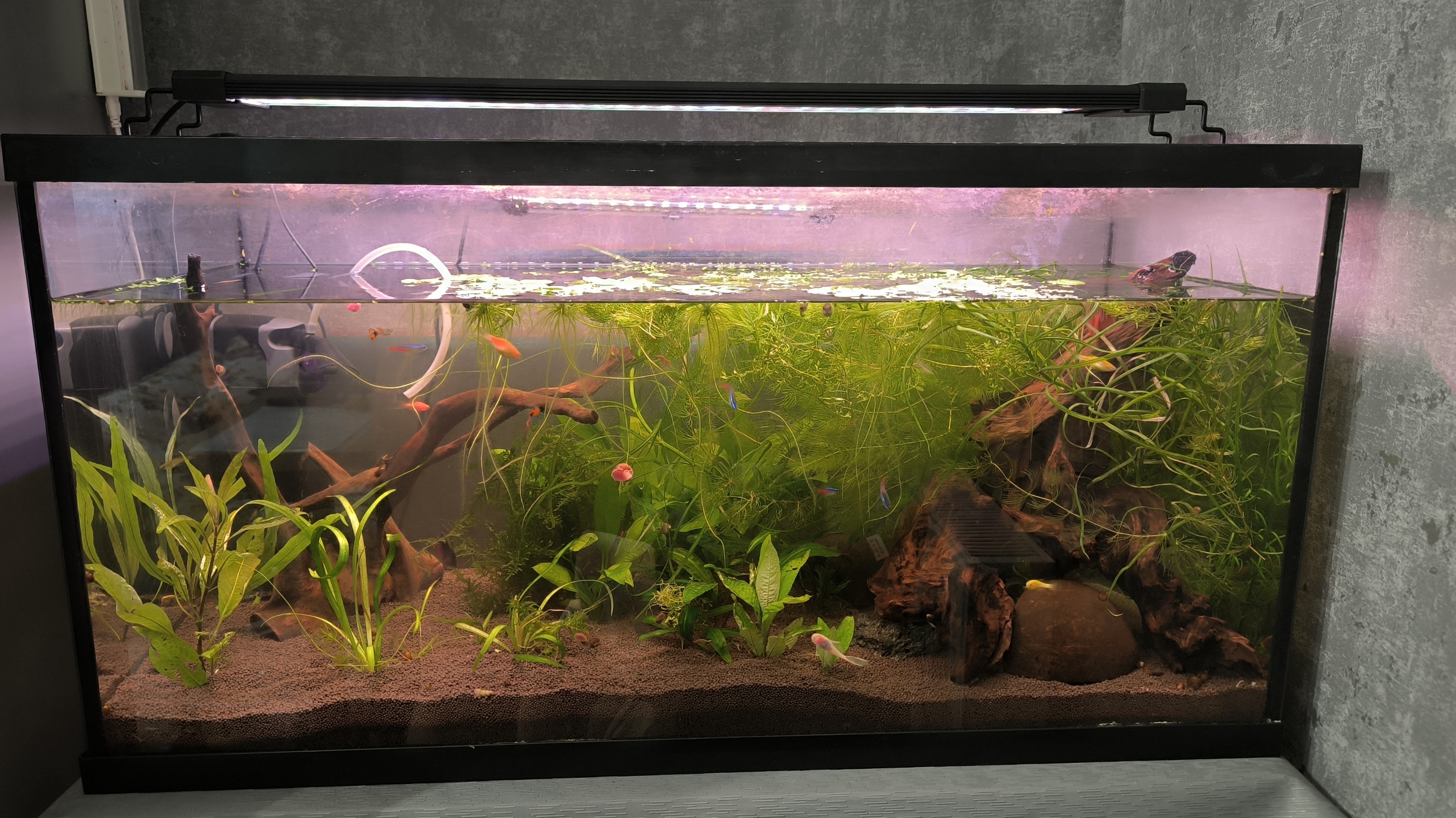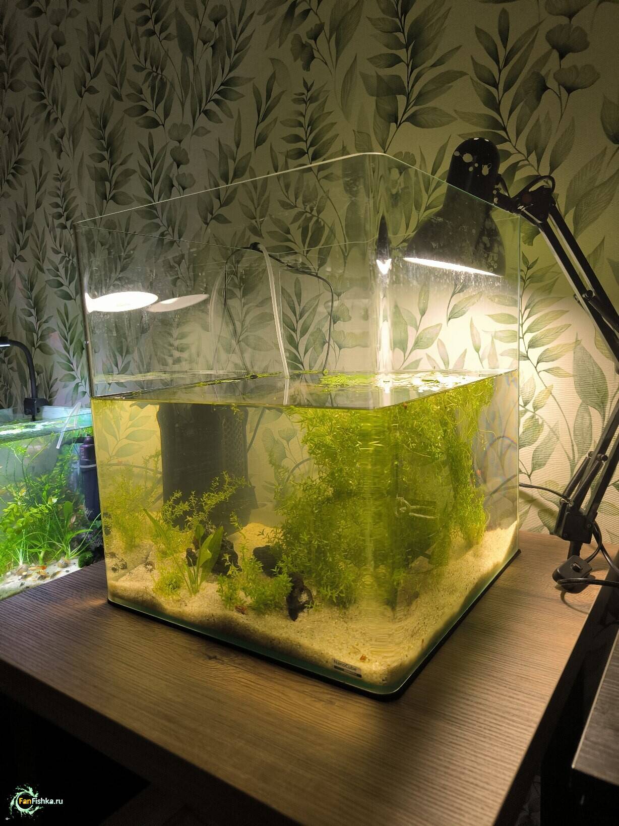Wildwind 0 Жалоба Опубликовано Monday в 21:05 С появления первого аквариума в моей квартире прошло всего два с половиной месяца, а их уже четыре. 🤣 Не устояла я перед кубом dennerle на 60 литров с Авито. Переезжать туда будет мой прикроватный кубик на 27 литров, который сейчас используется в основном как плантация растений, удобряемая 8 гуппи, 5 кориками, креветками и толпой катушек. Кого можно добавить на этот объëм? Но чтобы активно не жрали креветочную мелочь (хочу заселить линию блюдрим) и мальков гуппи? Данио точно не предлагать, они у меня в 100л живут, не рыбы, а плавучие заводики по переработке еды. 😅 И опять жутко актуальный вопрос про свет. На кубике сейчас стоит относительно неплохой свет для этого объёма Gloxy Q2 LED Plant 18 Вт, но понимаю, что 60 (за минусом грунта 55) литров он не потянет. Наткнулась на маркетплейсах на фитолампы. По мощности явно превосходят аквариумный Китай, есть таймеры, регулировка яркости. По цене тоже превосходят 😃 У кого-то есть опыт использования фитоламп в аквариумах? Или лучше воткнуть пару слабых китайцев? Рассчитываю примерно 30 ватт на 50 литров. В люменах ещё не научилась измерять. Из более-менее требовательных растений будут прозерпинака палюстрис, погостемон хелфера, риччия на кочках. Кубик полузапущен для заселения грунта бактериями. К выходным жду еще грунт и камешки. Фильтр будет внутренний, который стоит сейчас. Поняла что внешних боюсь. На фото виновник торжества и его младший братик, которого ждёт в скором будущем Авито 🥲, а также мои 100 литров, которые внезапно превратились в сомовник, в котором все, что плохо приросло, всплывает по утрам 😅 Сомовник с недоливом, так как им заливался куб. Поделиться сообщением Ссылка на сообщение