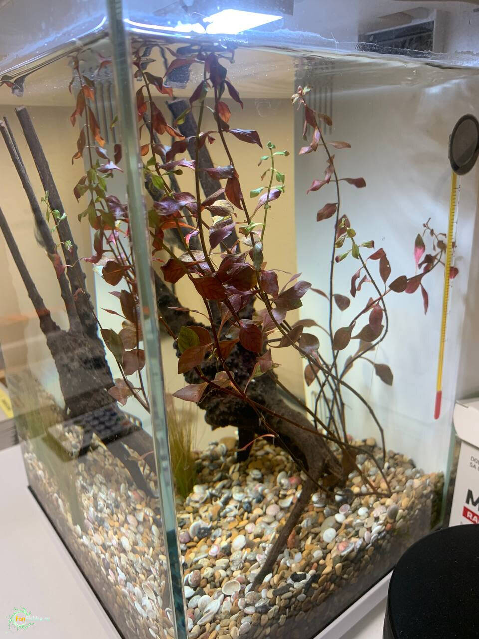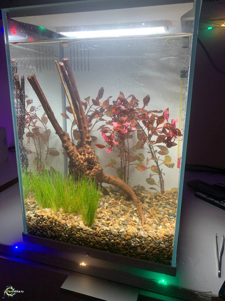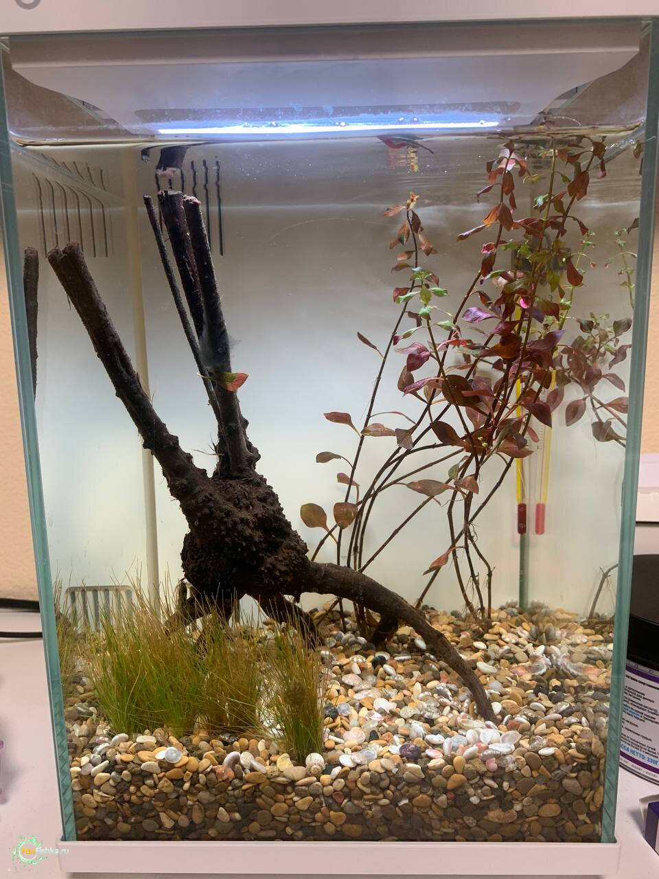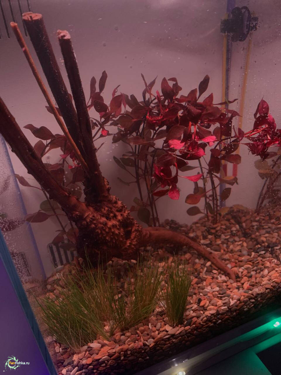 Запуск был почти 3 недели назад, в первую неделю красное растение выровнялось, коряга была покрыта бактериальной пленкой, это вроде как ок