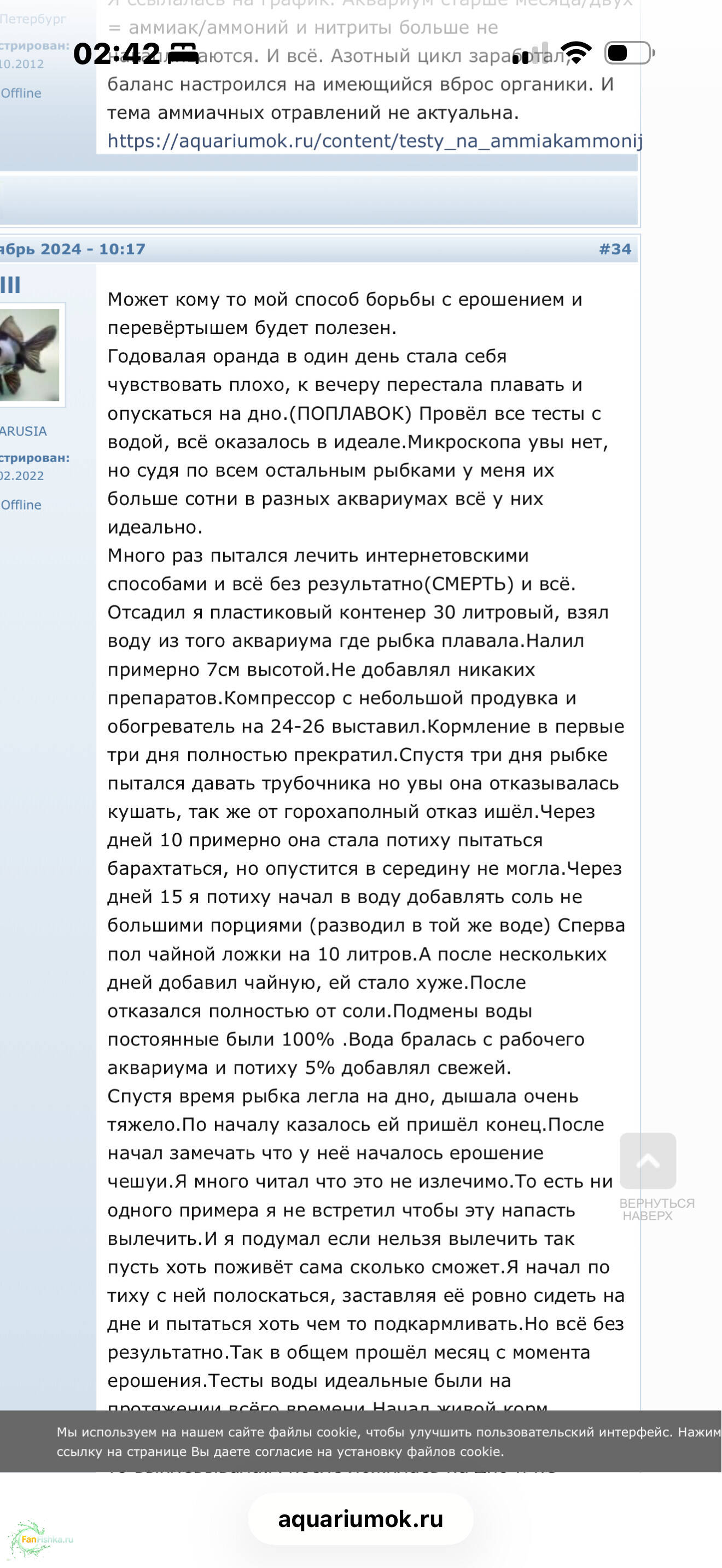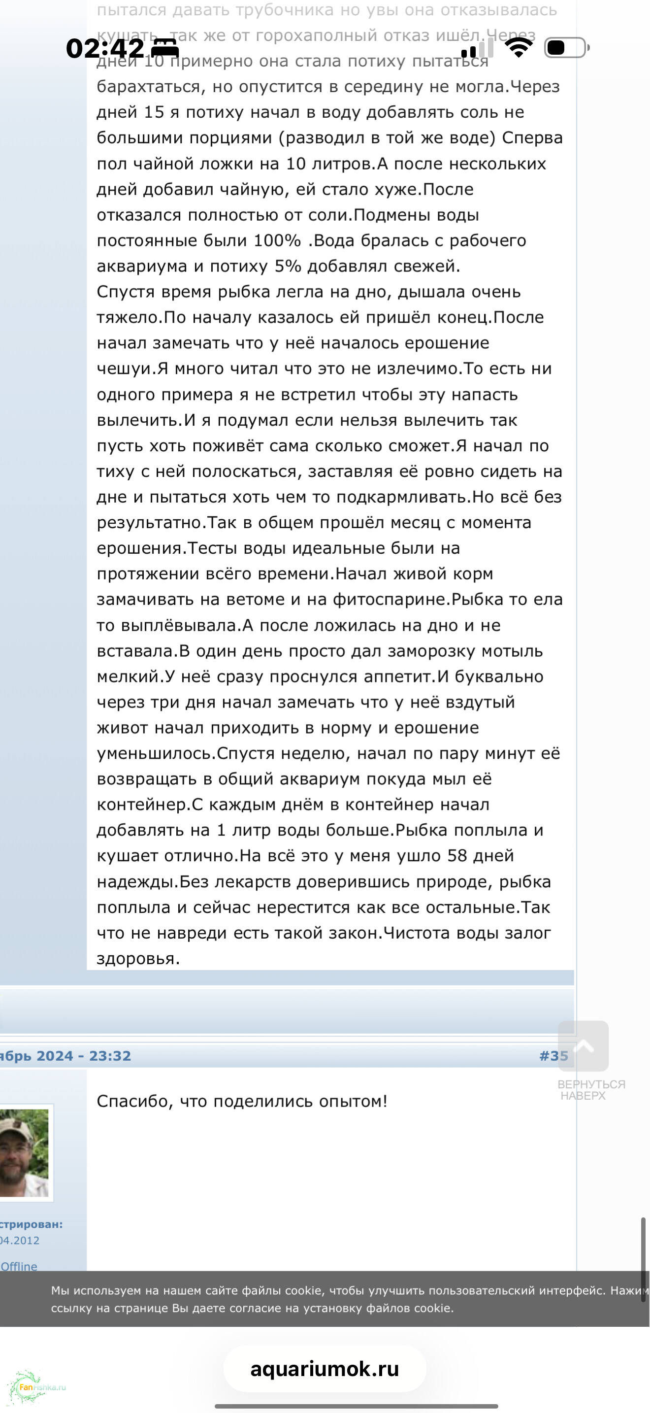 Варвара 0 Жалоба Опубликовано 20 февраля @soroka вчера была полная подмена воды и добавляла метиленовый синий @soroka увидела ещё такое лечение и отзыв от мужчины который спас в таком же состоянии рыбку, сначала думала попробовать такой метод Поделиться сообщением Ссылка на сообщение