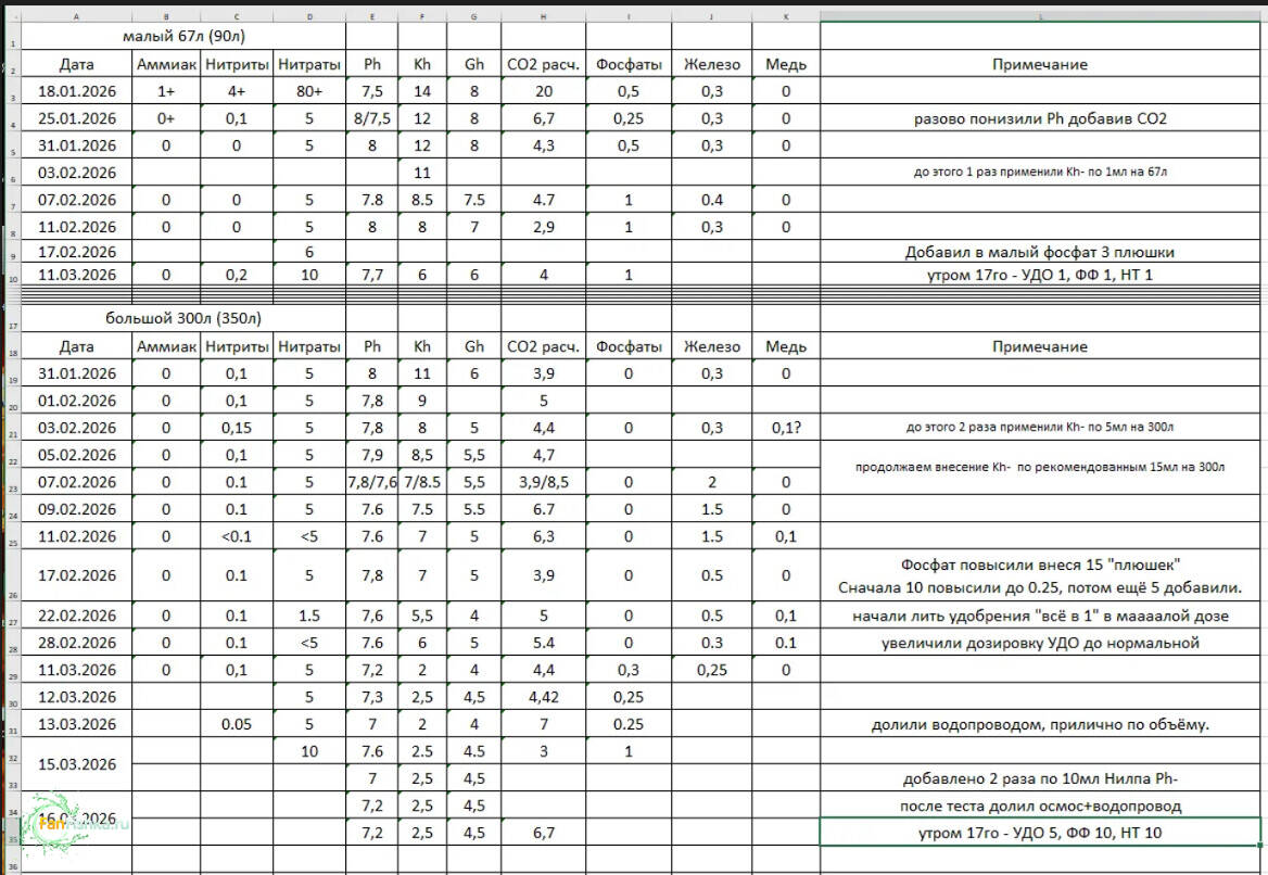 FunnyManNsk 8 Жалоба Опубликовано 9 часов назад Всем доброго дня. Пришло время сделать свой дневничок, чтобы не флудить в разных местах форума. В новогодние праздники решили завести аквас, естественно ничего не читали и не готовились. Запуск аквасов был не без проблем, об этом была отдельная тема , спасибо всем откликнувшимся кто помог мне. Теперь, спустя 3 месяца,у меня основной аквас на 300л воды (350 по стеклу), меньший на 67л воды (90 по стеклу) для взращивания мальков, ну и пару нерестовиков. В 300м у нас: Ггрунт пропант + подложка из соила, внешний фильтр, внутренний, растюшка всякая в асс (скоро ещё партию будем добавлять), СО2 добавка, свет 300вт на прожекторах , есть ещё лампа добавочная 21 вт (белый синий красный) включаемся для созерцания рыбов. Довольно много населения, а именно: Гуппи 9 шт взрослых и 7 мальков по кустам Данио 10 шт Коридорасы 6 шт Тетра пристелла 9 шт Тельматерина ладигеза 10 шт Неоны красные 15 штук Акантофтальмус кюля должно быть 6 шт, но что-то последнее время только 2 -3 видно, остальные видимо прячутся в монте-карло ( хотя если в кустах померли то их креветки утилизируют и не заметишь даже) Анциструс парочка Карилковый мексиканский рак 4шт где-то по кустам шарятся Ампулярия (М) 3 шт Хелена 5 шт Креветки жёлтые 20шт уже больших (тех что покупали) или ещё 130штук молоди Малом у нас: Свет какая-то небольшая лампа, на 8 Вт вроде бело синяя. Растюшки: мелкие анубиасы это ещё давно купили, а длинностебельку взяли прополкой из большого, пистия сначала зачахла, но теперь вроде начала расти. несколько анциструсов несколько ампулярий (ж) разделили их, а то надоели кладки везде делать. хелены 3шт где-то прячется креветка фильтратор мальки данио подрастают, в сумме около 30 штук креветки жёлтые 20 штук молоди. Грунт была галька, но на той неделе заменили на пропант, он нам понравился в большом, тут решили такой же сделать. Меняли одномоментно, с сохранением 80%+ старой воды, всё успешно, даже азотистые не скакнули. Для общего понимания ситуации: Живём в частном доме, вода с водопровода идёт из артезианской скважины в обществе, жёсткая (kh14 gh8 ph8). В покупном автомате с водой берём на разлив воду почти как осмос. Каналья - септик, ставить свой осмос замучаемся его откачивать, а это довольно дорого. Исходя из этого стараемся не подменить воду, а только доливать. Вода в аквасах: Спойлер Из неприятного: В большом одолевает гадкая водоросль Спойлер Недавно начала активно расти, потом стал вносить нитрат+фосфат+удо комплексное, вроде замедлилась немного, но не знаю что с ней делать чтобы вывести совсем. Ну и мелкие зелёные точки на стекле, ксен вроде, пока просто чистим его раз в неделю. 1 Поделиться сообщением Ссылка на сообщение