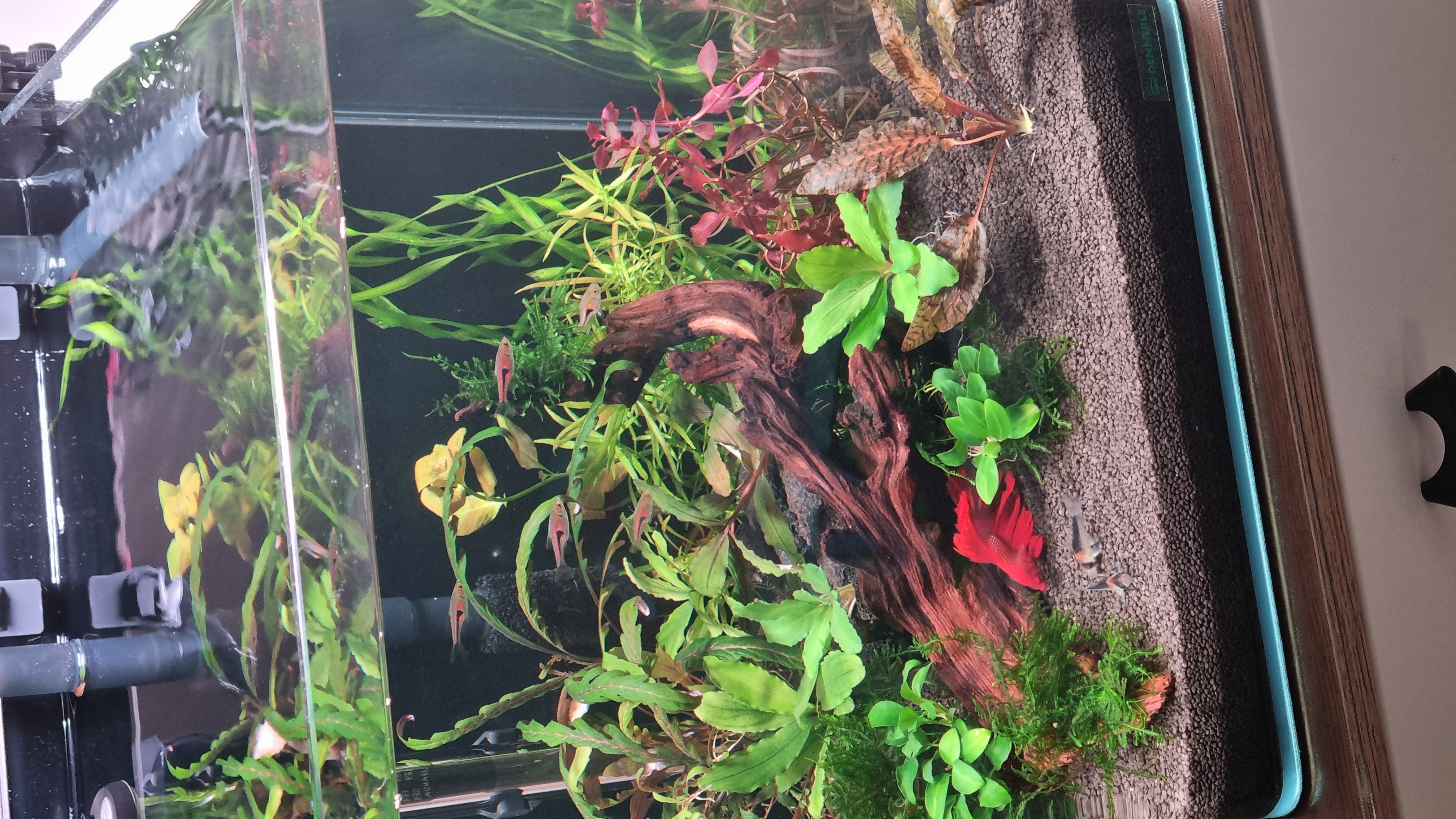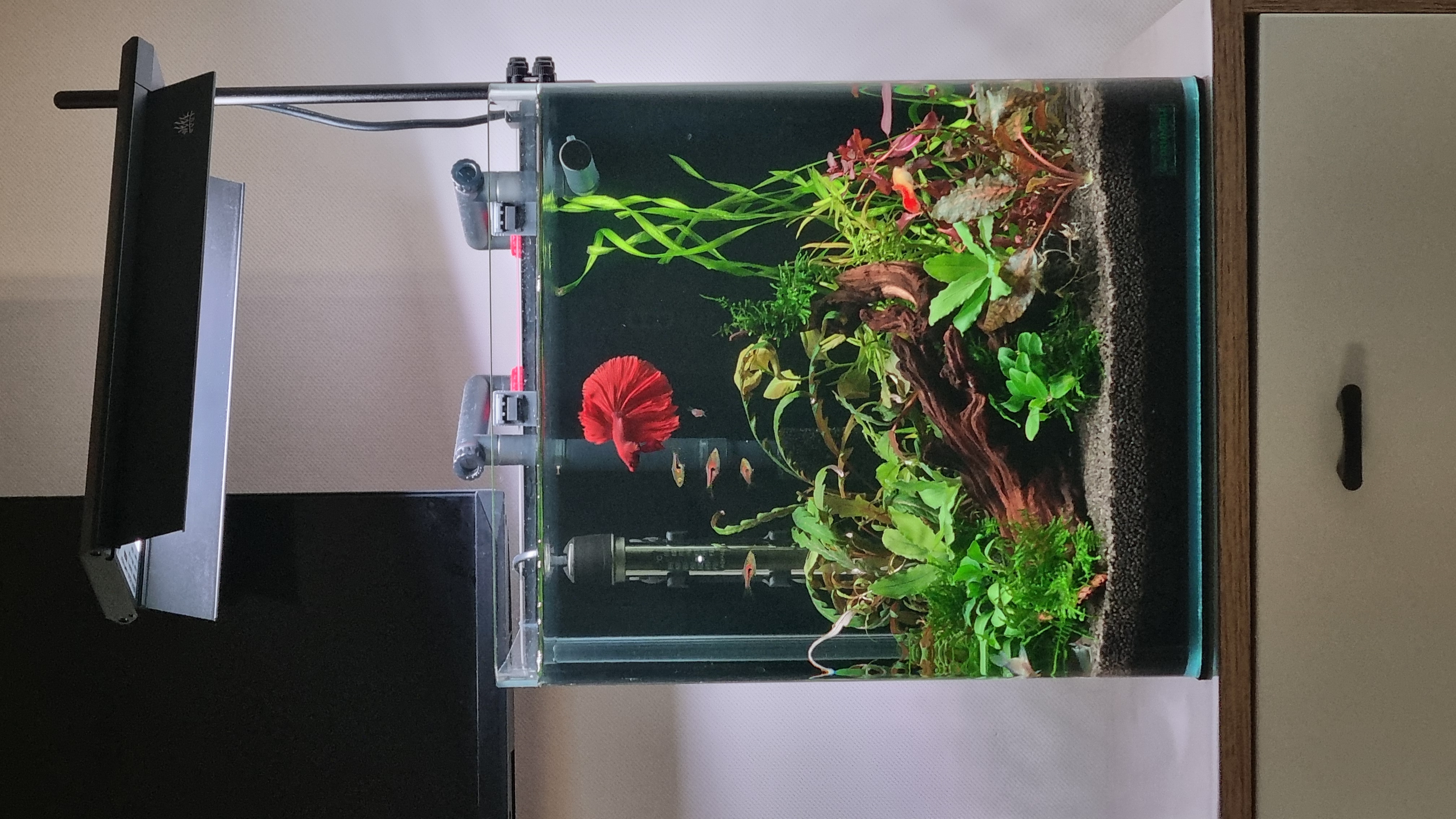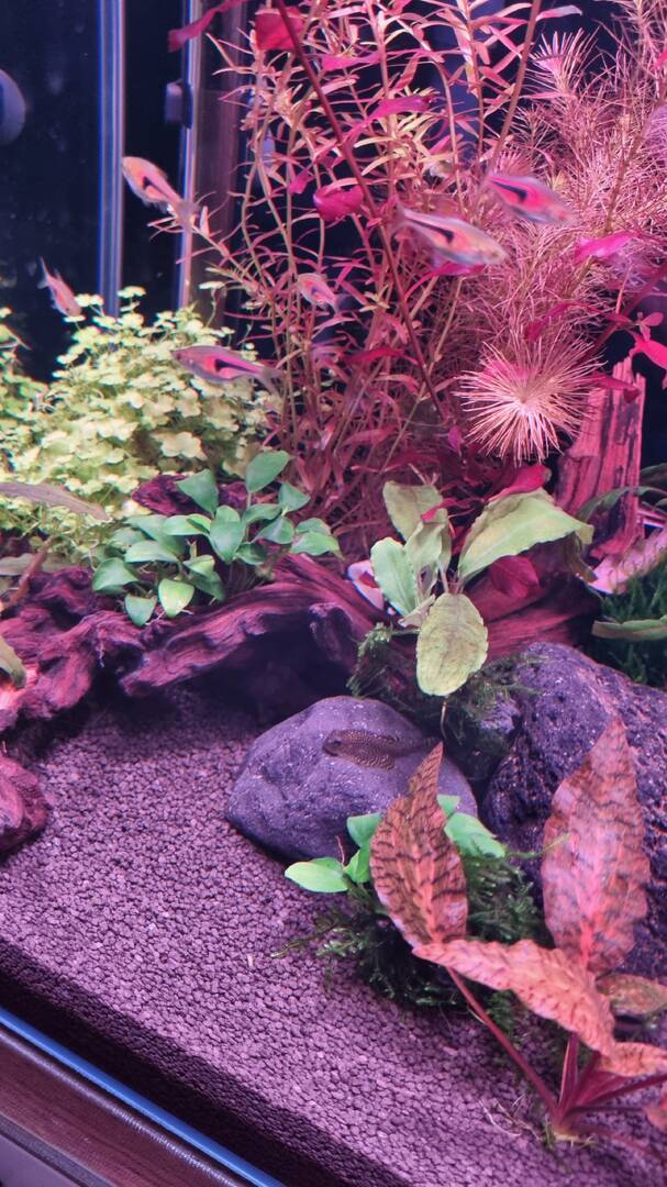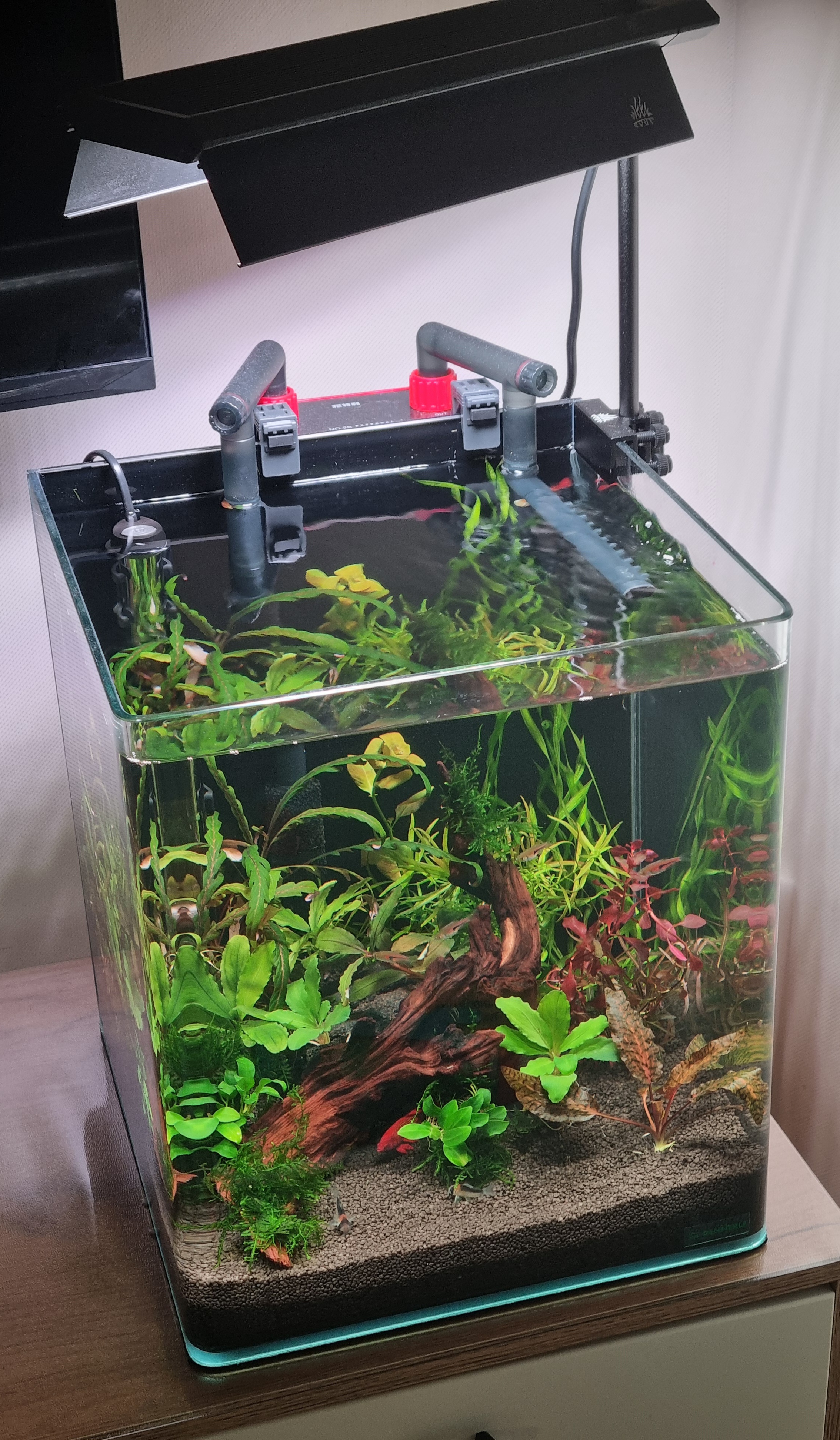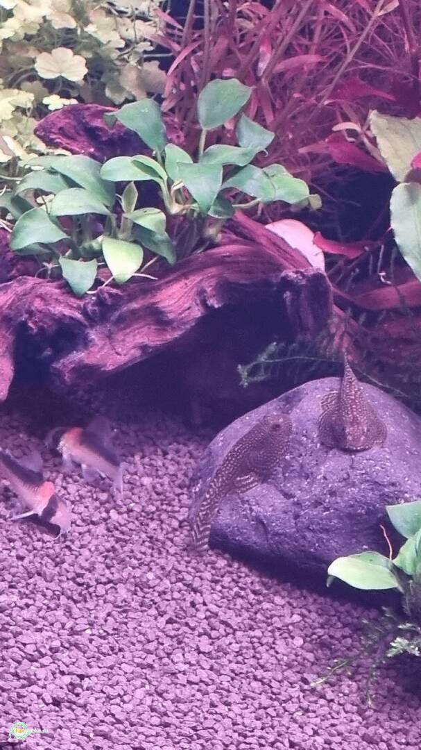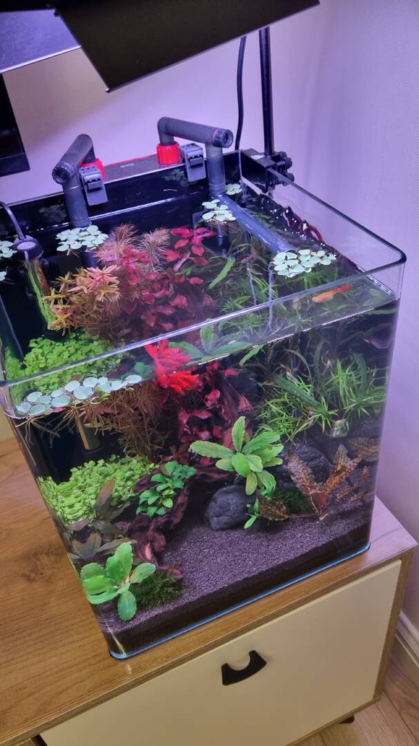 FiriSafo 12 Жалоба Опубликовано 10 апреля Оборудование: Аквариум Dennerle Nanocube 30 литров, 30x30x35см -воды по факту залила 27 л Грунт Dennerle CrystalQuartz Gravel(1-2 мл) 5-6 см Фильтр рюкзачный NETLEA NO.2S 600 л/ч,7 Вт Нагреватель Aquael PLATINIUM HEATER 50W Светильник WEEK AQUA S300 Pro Ver.3 Полноспектральный LED с RGB+UV, 25Вт, 1500 lm Аквариум запущен 20/03/26 без света. Запустили сразу петушка, так как жить ему было негде. Запускалась на стартовых препаратах (Tetra Safe Start, Bactozym, Tetra AquaSafe). Делала тесты каждые 3 дня: аммиак так и не показался, нитрит примерно на 6 день показал около 1. Начала делать подмены каждые 2 дня по 8 литров. Аквариум стоял без света, постепенно становился цвета темного чая, ввиду наличия большой мангровой коряги. Подмены вообще не помогали. Бак вспышка может и была, но не разглядела. Достала корягу и начала заливать ее каждые 12 часов кипятком с солью. 5 дней это продолжалось, потом мне надоело, так как ничего не менялось. Решила ее оставить на будущее, когда будет стабильный баланс сделаю редизайн и добавлю пуриген в фильтр. Вместо нее выварила коряжку поменьше (вроде мопани). После варки -два дня по 6 часов- не красит. 3/04/26 наконец доставили светильник, решила скорее садить растения. Собиралась купить в ammania.ru, но побоялась долгой доставки, да и сумма выходила внушительная. Поискала в городе у частников, не прогадала. Вышло в 4 раза дешевле и в два раза больше растений. Растения красивые и здоровые, это видимо пока... Растения: Мох рождественский (Vesicularia montagnei) Криптокорина Нури (Cryptocoryne nurii) Гигрофила Арагвая (Hygrophila sp. Araguaia) Гигрофила Пиннатифида (Hygrophila pinnatifida) Людвигия Бревипес (Ludwigia brevipes) Людвигия нотанс (Super red) Людвигия Марилия (Ludwigia Marilia) Валлиснерия (Vallisnéria) Буцефаландра зеленая волна (Bucephalandra green wavy) Буцефаландра Чериш (Bucephalandra sp. Cherish) Буцефаландра Вест Калимантан (Bucephalandra West Kalimantan) Анубиас Нана петит (Anubias barteri var. nana «Petite») В компанию к петушку сначала была запущена гуппи. На гуппи проверили агрессивность петушка и можно ли к нему соседей. Петушок оказался мирного нрава, интерес к гуппи потерял через деять минут. Поэтому в два этапа купили еще рыбок. Сейчас в акве: 5 расбор эспеи (Trigonostigma espei) 3 коридораса дупликариуса (Corydoras duplicareus) 1 петушок (Betta splendens) 1 гуппи (Poecilia reticulata) Параметры воды на 10/04/26 (22 первый день запуска): Температура 25 °C PH- 7,2 /7,4 KH – 3 GH – 4 NH3/NH4 -0 NO2 - 0 NO3 - 5 PO – 0,25 Подскажите, пожалуйста: 1) Растения росли раньше с CO2, прошло 6 дней после посадки, пока не растворяются, криптокорина даже лист выпустила. Баллон с лимонкой тоже заказала, но видимо ждать еще неделю-две. Свет сейчас 6 часов на 30 %. Это получается 1500 лм* 30% = 450 лм /27 л. =17 лм /литр? Это же мало как-то совсем. Добавить? Вообще где-то встречала, что для RGB светильника считать в люменах не корректно? А как тогда? Лампа у меня 24 ватта. 2) Удобрения надо добавлять уже или нет? Какой фирмы лучше приобрести? Моносоставы или комплексы? 3) Аэрация сейчас только от флеты рябь, постаралась сфотографировать. Так нормально? Течение сильное, поэтому в стенку флейта, поток разбивается и вниз уходит. Как понять, что кислорода хватает? 4) На вторую неделю в акву была запущена одна улитка неретина, померла на второй день. Они всегда такие нежные? Хотела еще неретин купить, но теперь думаю, может какую-то другую лучше? Подскажите, пожалуйста, каких можно, полезных? 5) Для подмен отстаиваю сутки воду из-под крана, чтобы вышли газы, температура стала комнатной и меньше греть надо было. П