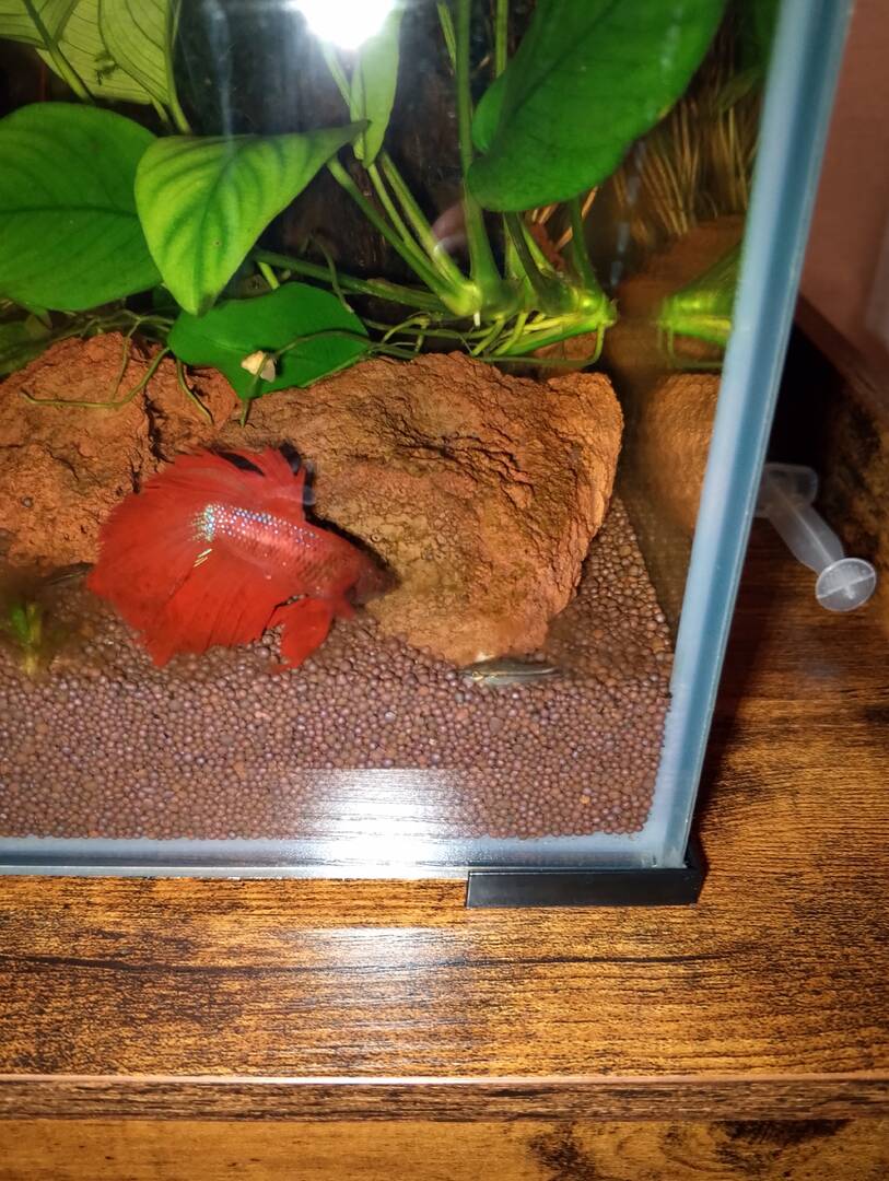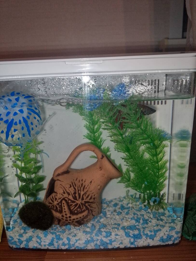 Yalomi 5 Жалоба Опубликовано Saturday в 10:20 Я начинающий аквариумист, прям самый 0 из 0. Будет много букв, очень хочется поделить .) В обще аквариум не планировался никогда. Иногда, конечно, возникали мысли, мол поставить бы аквариум, красиво же, но на этом все и заканчивалось, т.к. возиться и заниматься всем этим совершенно не хотелось. В обще я люблю котов.) А прошлым летом моя дочка вдруг начала рисовать рыбок и подводные миры. Ближе к дню рождения она заикнулась о том, что хочет аквариум. Я ответила категорично, мол ни за что.) Тогда она попросила искусственный с ВБ, где плавают бумажные рыбки и медузы с подсветкой. А тут сноха спрашивает, мол что им дарить Алисе на ДР. Я сказала, что ни будь рыбное, но главное не живое) А она мне говорит, что была на днях в салоне и там у них в круглой стеклянной банке плавает очень красивая рыбка. И там же с ней поделились информацией, что это мол такая вот уникальная и без проблемная рыба, которой на фиг ничего и никого не нужно и она может жить вот так без ничего в вазе и радовать глаз. Мне эта мысль понравилась, и я поделилась ей с дочкой. Было решено, что уж такую рыбу мы точно можем завести. Хорошо хоть все же решили покупать не круглую вазу, а какой ни есть мини аквариум. Такой нашелся на ВБ и даже с фильтром и подсветкой на 4,5л. Дождались приезда этой банки и поехали всей семьей в зоомагазин за рыбкой. Там нам с радостью подсунули «красивый» бело-голубой грунт, искусственные растения и отсыпали на развес корма в виде хлопьев. Потом показали рыбок в пластиковых стаканчиках. Дочка хотела синего петушка, но там такого не было в итоге выбрала красного. Сидел он бедолага в стакане не шевелясь, но нас заверили что это молодой самец 3 месяца от роду и совершенно здоровый. Расплачиваясь на кассе, я вдруг вспомнила (не знаю от куда), что есть такие водоросли в виде зеленых шариков, так мы купили еще и кладофору. Рыбку с кладофорой засунули в шапку, специально взяли ее с собой, т.к. на дворе была зима. Дома промыли аквариум, грунт и растения под проточной водой. Хорошо, хоть это я успела прочитать. Воду налили отстоянную. У меня много комнатных растений, поэтому всегда есть отстоянная вода в бутылях. Бедного рыба мы запустили махом в налитую воду вместе с водой из пакета и кладофорой. Сейчас жутко думать в каком шоке он был. Рыба дочка назвала Аидом, тк очень увлеклась мифами древней Греции. Если бы рыб был синим как она хотела изначально, то его звали бы Посейдоном. Картинка у нас вышла классическая. Бедный петушок сидел в маленькой банке с искусственными растениями. Хорошо хоть догадались со всеми декорациями взять для него глиняный кувшинчик. https://disk.yandex.ru/i/jl3Ji35Mr9pHYg Через какое-то время, я заметила, что Аид повредил свои шикарные плавники и чаще всего сидит прячась за искусственным кустом. Чую что-то не так с ним. https://disk.yandex.ru/i/upgDdoF6d0sAKw Ребенок кормил его ответственно раз в день. Пытливый мамин мозг начал изучать информацию и оказалось все совершенно не так, как нам рассказывали про эту рыбку. В общем выкинула все искусственные растения из его банки, через авито купила ему ветку роголистника и пистию. Заказала с озона листья миндаля и положила в воду кусочек листа. Плавники вылечила Альтерфиксом, вычитала про него на одном из форумов. И рыб наш ожил, стал активно плавать. Но оставлять его в этой банке было нельзя, поэтому я решила купить н
