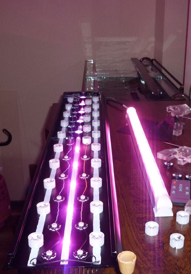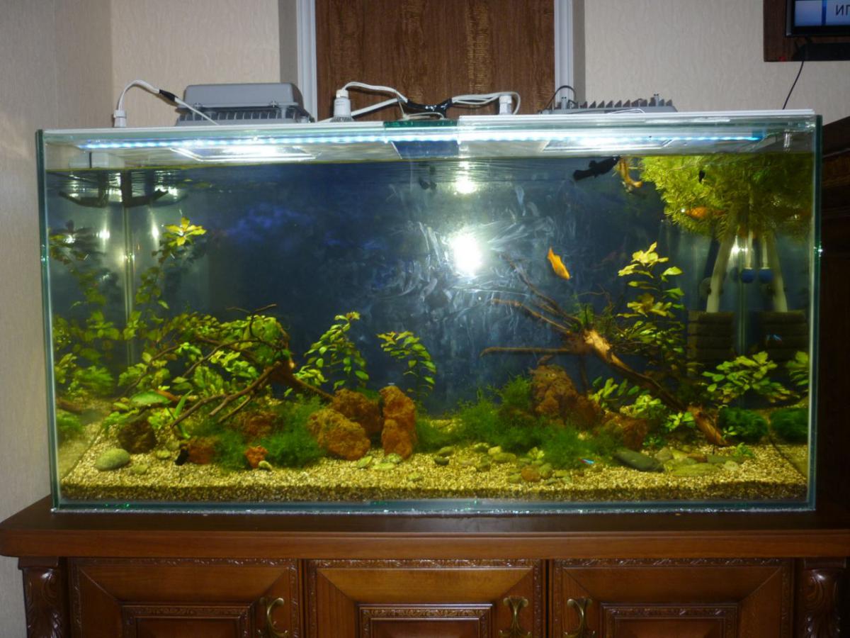 Joy 7 Жалоба Опубликовано 28 декабря, 2016 Моя эволюция LED освещения, прокачиваем китайскую ветку Изначально был аквариум 40л. и с однойлампочкой ильича 40Вт. Заменил её на 3 лед лампы по 3Вт. с цоколем GU5.3. Результат понравился, стало ярко но всё заросло бородой. Решил расширяться. Установил 200 литровый аквариум. Изначально было 2 прожектора Jazzway по 30Вт. 2500люм. каждый и 4 led лампы по 5Вт. с цоколем GU5.3 Для эксперимента бала докуплена одна лед фитолампа на 10Вт. уж больно хорошо её "минифермер" разрисовал. Так же была куплена ещё одна лед лампа 18вт. 1200 люм. 6500К - дизайн понравился. Решил избавится от городушек и сделать одну лампу. заказал с али 1. Набор алюминиевой лампы 90см: радиатор, защитное стекло, линзы, РСВ пластины. 2. Набор контроллера с драйверами https://ru.aliexpress.com/item/led-DIY-led-aquarium-lighting-90w-automatic-dimming-Day-night-auto-dimming-led-grow-lighting-90w/32317689774.html?ws_ab_test=searchweb0_0,searchweb201602_4_10065_10068_10084_10083_10080_10082_10081_10060_10061_10062_10056_10055_10054_10059_10099_10078_10079_10093_426_10073_10102_10096_10052_10050_425_10051,searchweb201603_1&btsid=14f3a7cd-98f1-4159-9f06-a048560a96b1 3. Светодиоды 30шт-6500К, 10шт-фул спектр, 10шт-синие Общая расчетная мощность лампы составляет 150Вт. 8000люмен Про Led контроллер LED Intelligent Lighting Ни какой возможности реализации плавного рассвета заката нет! Это копия какого то нормального контроллера который применяют в дорогих фитолампах. Прошивку правда засунули упрощенную. Не работает яркость дисплея (при изменении параметров ничего не происходит а вот контрастность работает отлично ). При отключении электроэнергии необходимо ручное вмешательство, т.к. появляется надпись Lock и диоды не горят. Кнопки реагируют очень плохо, но выручает пульт ДУ, с него всё работает ОК. Контроллер разочаровал своим скудным функционалом. У него 5 каналов, и каждый из них можно разбить максимум на 5 временных отрезков, один из которых будет занят на ночной режим полного отключения. Таким образом в распоряжении только 4 временных интервала. Переключение между интервалами происходит ступенчато а НЕ плавно! Про радиатор Качество порадовало, покраска хорошая, увесистый. В общем понравился! Рассчитан на рассеивание 90вт. тепла (30 диодов по 3вт.) в пассивном режиме. В данный момент справляется с 48 диодами которые в пике нагревают поверхность радиатора примерно до 47-50С (прожектора грелись больше но я их не замерял, руку больше 20 сек. не удержать было) Опоры крепления к самому аквариуму неудобные в использовании, лишний раз трогать это конструкцию неохота! Прожектора светили достойно! При малой и средней растительности их было достаточно. Но не было возможности контролировать световой поток в течении всего дня. Под ними развивалась бурно и нежелательная растительность особенно задрала нитчатка в ричии, камни мгновенно позеленели и стали обрастать какой то зеленоватой мохнатостью буквально за месяц интенсивного использования, пришлось снизить световой день от прожекторов до 4 часов, досветка производилась четырьмя сд лампами по 5вт. восемь часов в день. Так как лампы досветки находились ближе к переднему стеклу, то оно быстро покрывалось зеленым налетом. Под прожекторами растения пузыряли а под досветкой нет. После установки этой лампы растения стали активнее пузырять, листья людвигии из зелёных стали розоветь. Из-за линз свет стал меньше попадать на боковые стенки и они стали меньше заростать. Но хотелось всетаки нормального рассвете/заката а не ступенчатого четырё