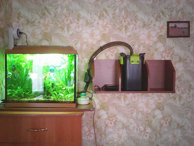 По поводу шлангов и полки. Полку специально из за фильтра пришлось прибить, ее там быть не должно, а если ее пониже опустить, то совсем не годится, так как аквариум стоит на комоде, возле комода кровать, а полка как раз над кроватью повисла и ниже ее ну просто ни как. На пол тоже фильтр не поставить, так как высота комода без аквариума ну метра полтора, наверно, думаю что помпа не потянет да и мешать он будет перед комодом то, да и ребенок свернуть может. Вот пока ему места не нашлось, думаю на уровень комода его опустить, только на что поставить/повесить не знаю.