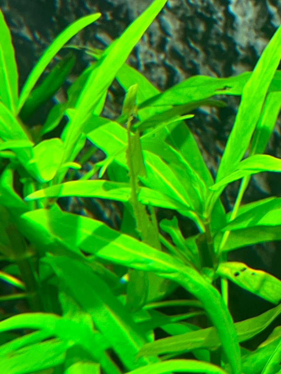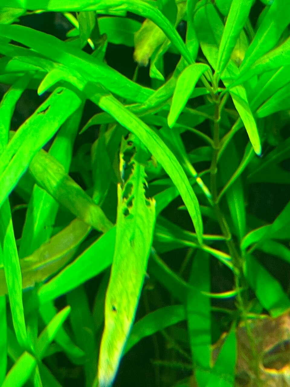 Последнее время заметил, что на листьях гигрофилы иволистной стали образовываться дыры, листья местами как рваные. Обитатели аквариума растения не едят. Свет  - 2 прожектора по 10Вт (6500К, 1000Лм).