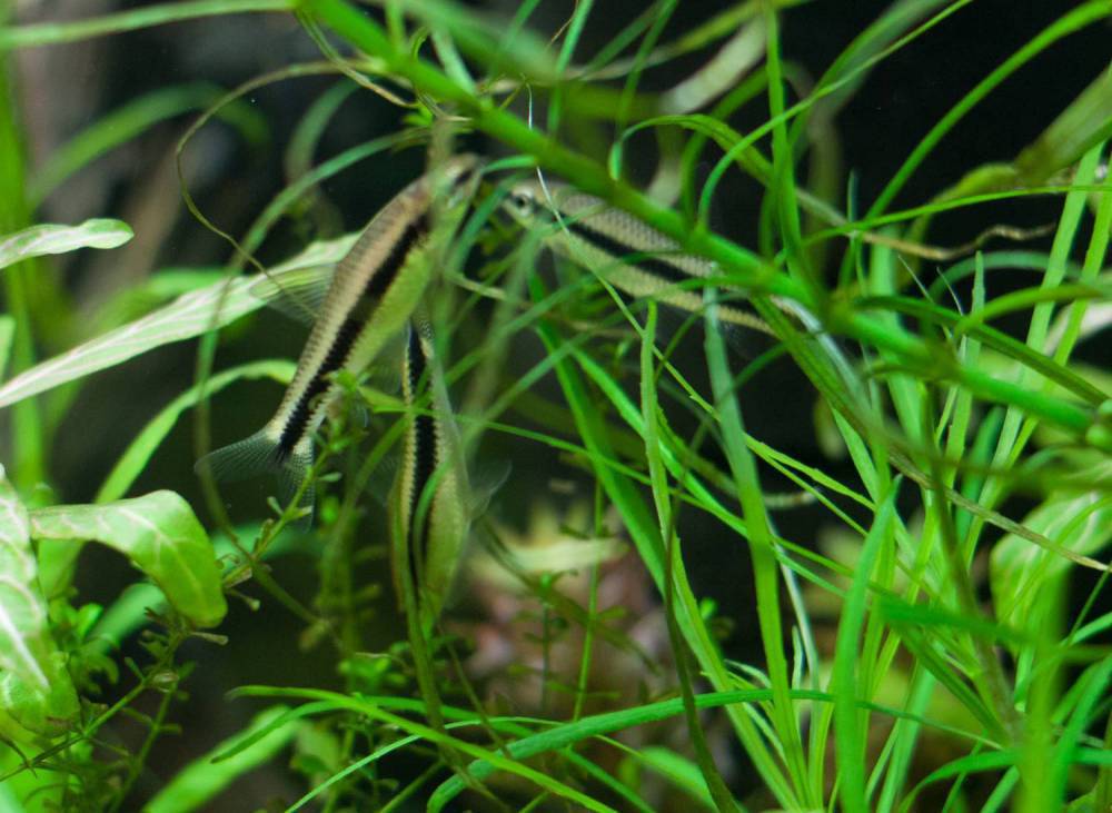 Ну да не выдержал и ради эксперимента, в большей степени, и густо заросшей области в правой части аквариума, куда Скалярии не лазят - было запущено 6 Вишен.