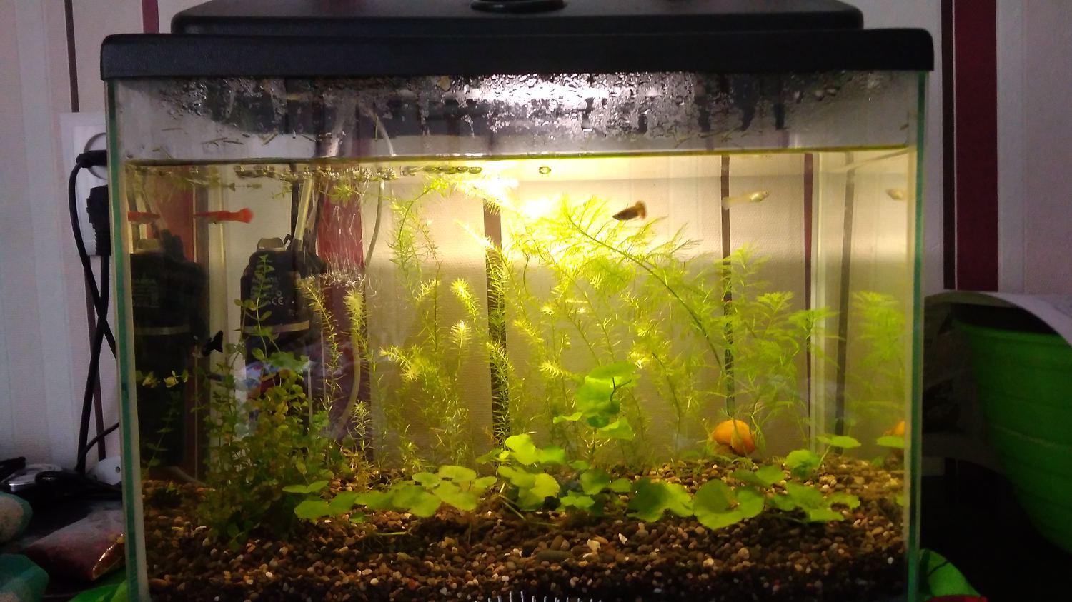 Гуппи зависают на одном месте, одна рыбка трется о растения