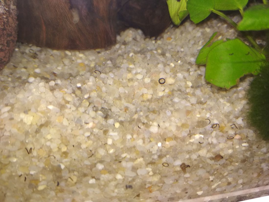 По всему аквариуму появились мелкие черные колечки и их части. Присутствуют и на грунте, и на листьях. Похоже просто разносятся фильтром.