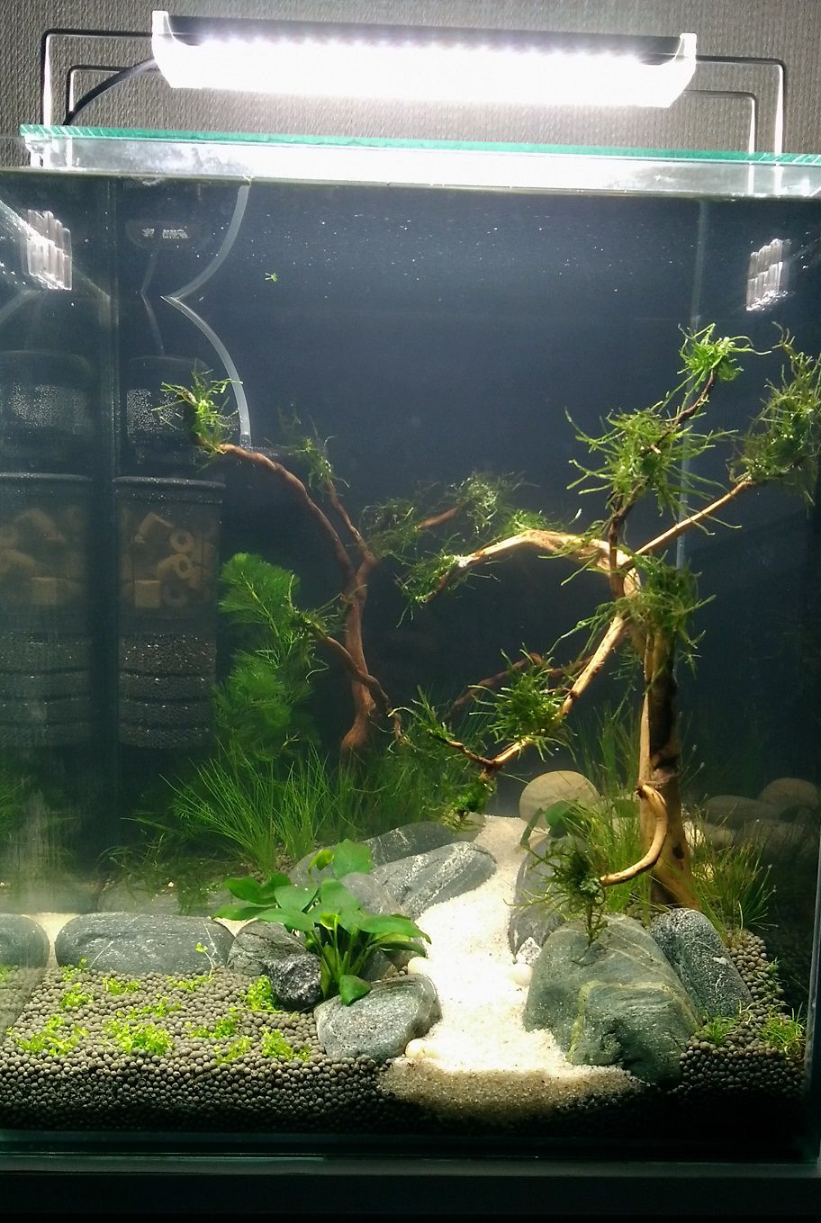 Yurax 15 Жалоба Опубликовано 23 октября, 2018 @Галина Knyagna Спасибо, так вчера и сделал. Правда приклеить не получилось. Просто зажал между камней. Вчера залил аквариум. Ошибки которые были: Подготовленные коряги приклеил на герметик к камню. Одна удачно, вторая в процессе оторвалась. Данный способ плохо применим при создании композиции если помещать в аквариум после создания ландшафта. Камень вытесняет грунт и горка начинает деформироваться. Нужно коряги было закреплять/засыпать грунтом на начальной стадии. Клей для мха, как я и боялся побелел. Думал что цианоакрилатные клеи одинаковые, оказывается нет. Таблетки Ермолаева, часть всплыла, когда сажал травку. Итог был утром, равномерным черным слоем осели на грунт, буду думать, как собрать. Видео чуть позже. Ну а в целом - так.... 4 Поделиться сообщением Ссылка на сообщение