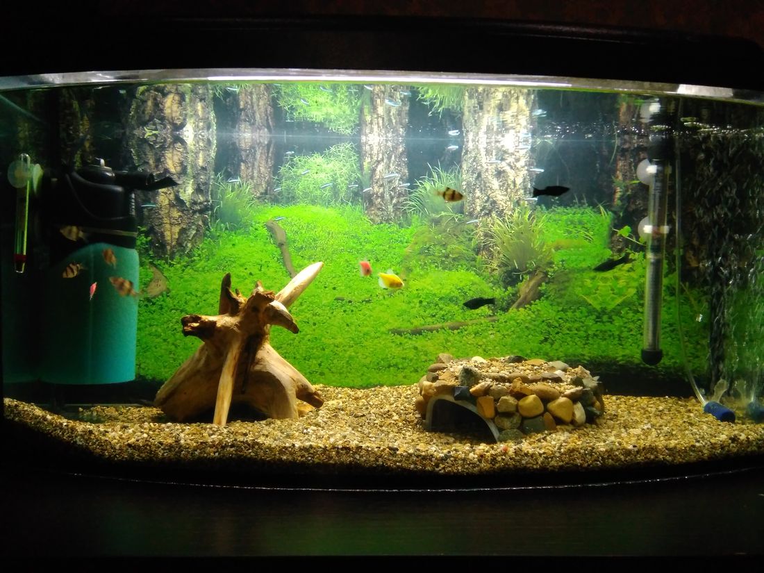 ВалентинKRD 0 Жалоба Опубликовано 26 февраля, 2019 Добрый день. Помогите с несколькими вопросами: направление течения, когда же уже нормализуется биобаланс. Аквариум панорамный на 102 литра(с крышкой),размеры 80×27×45. Фильтр внутренний Акваэль 3фан+ на 700л/ч. Подогрев,аэрация. Лампа светодиодная цоколь G13 6500K, около 1250Люмен. Горит 14 часов в сутки. Грунт- строительный отсев фракции 2-4мм, хорошо промытый,обработан кипятком и маргацем. Коряга натуральная, нашёл в лесу не гнилую,обработал от рыхли ножом и наждаком,немного обжог огнем и обработал марганцем. Обитатели: 5 барбусов, 3 моллинезии, 3 тернеции, 1 взрослый анциструс( около 20 см). Растений нет. Запускал с донным фильтром,прошло 4 дня с включённым фильтром,думал вода будет чистой,но нет,тогда убрал донный фильтр и поставил штатную крупнопористую губку и запустил анциструса с 3-мя литрами воды из действующего аквариума(думал помоч бактериям). Выложил корягу. Через три дня сделал подмену воды(20л) с сифоном грунта, помыл фильтр с водой из аквариума. Еще через неделю добавил остальных рыбок и спустя 2 дня опять подменил часть воды с сифоном грунта и чисткой фильтра. После 5 дней вода не становилась кристально чистой,решил заменить на мелкопористую губку,правда она в стакан не влезла,допустил ошибку что губку не вымочил в воде из старой губки(получилось что она попала в аквариум без нужных бактерий). Спустя 2 дня заменил все так же воду и почистил грунт. Все время течение направлено было вдоль задней стенки и в среднем положении,уже как день течение направлено по диагонали от заднего левого угла в сторону противополжной боковой стенки(в середину стенки и немного насадкой направленр вверх),силу потока убавил,чуть меньше половины. И вот уже 4 дня остаётся все та же картина,вода вроде и чистая,но не такая как хотелось бы кристальной. В лобовую если смотреть,то чистая,а сбоку через всю толщу видна муть и мелкие взвеси. Кормлю только утром,не перекармливаю,съедают минуты за 3-4 всё. Только немного на ночь сомику даю и свет гашу,а то он только в темноте активизируется. Может времени мало прошло для установления биобаланса или течение сильное или слабое,может не в том направлении поток идет? В нете нет ответа о сроках по бактериям и силе и направлении течения. Заранее благодарю! Поделиться сообщением Ссылка на сообщение